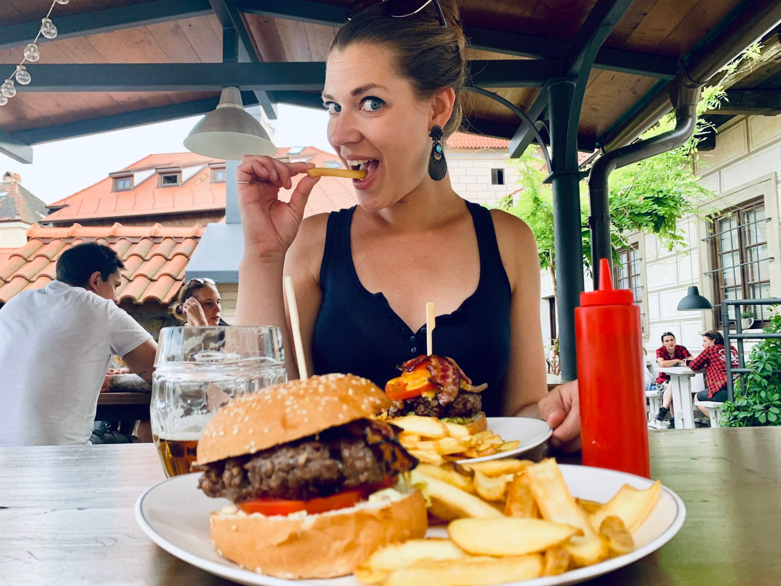Adjacent to one of the better hostels in town, this restaurant serves a mix of international fare, ranging from filling salads and burritos and burgers. We tried their beef burger with topping of cheddar cheese, bacon. Burgers were huge, pretty decent and accompanying fries were fab (price for burgers start around 229 CZK). They serve a range of excellent beers on tap here including Budvar from nearby České Budějovice.