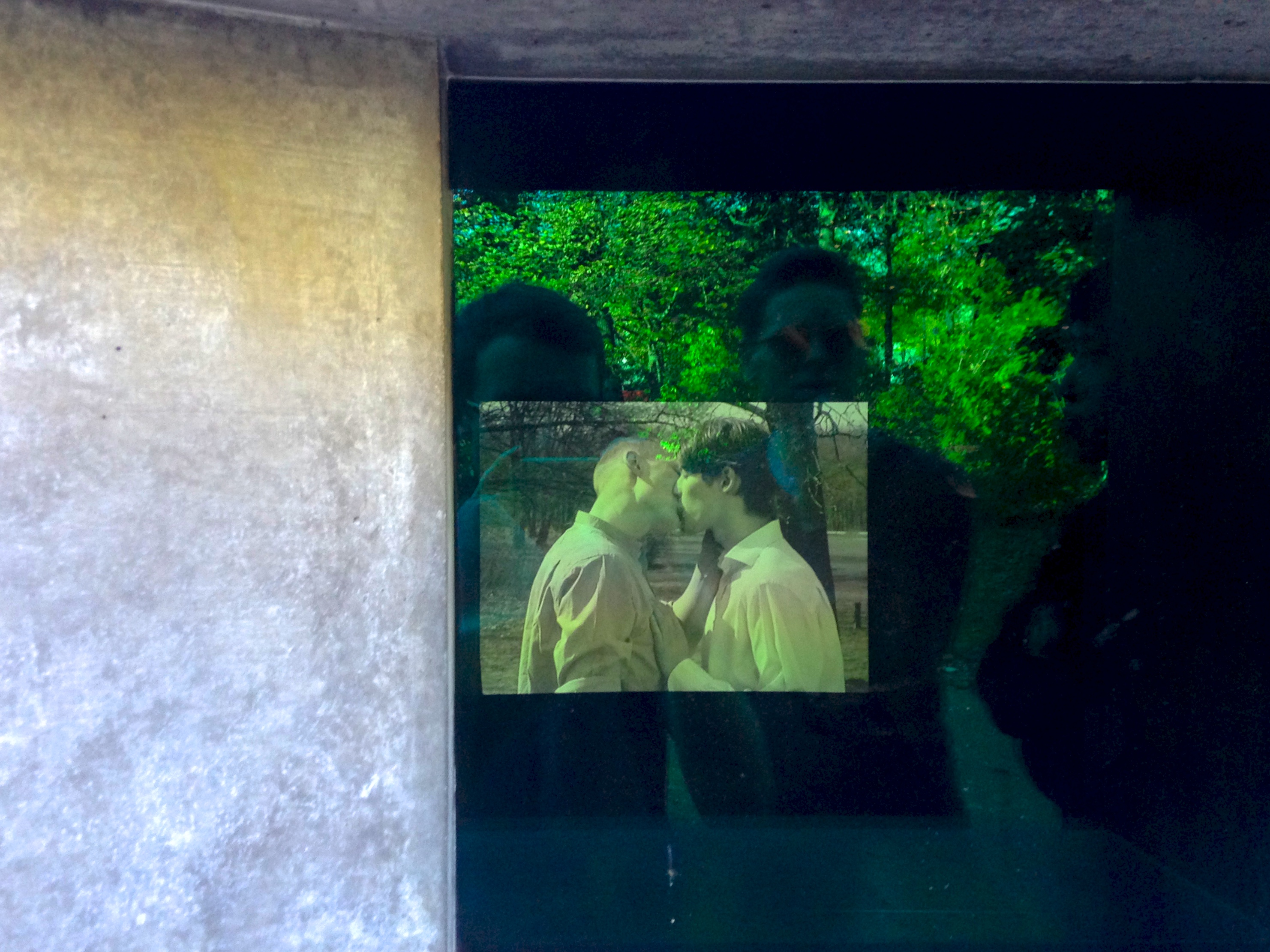 Across the street just inside the largest of Berlin’s parks, Tiergarten, is a lesser known but just as important Memorial to Homosexuals Persecuted Under Nazism. The memorial is a single concrete block with a window behind which images of same sex couples kissing are displayed on a screen.