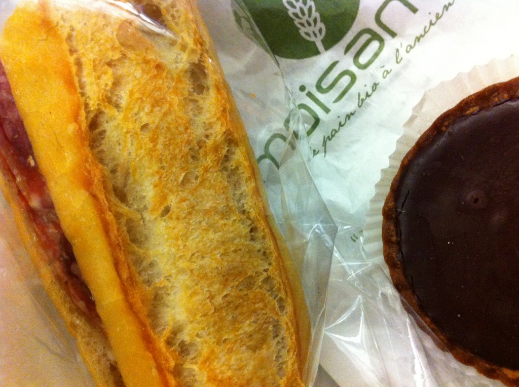 Quick but v tasty lunch at Moisan in Place Maubert: Baguette with saucisson & chocolate tart: 6 euros.