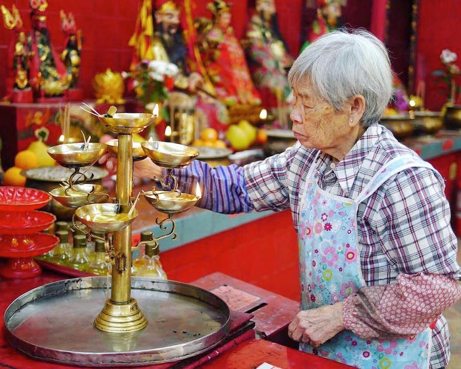 Old wrinkled chinese lady lighting incense sticks at the Tin Hau temple in Stanley.