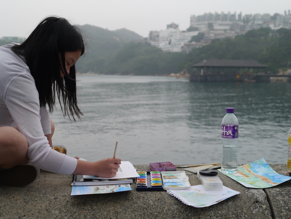 Girl painting the harbour at Stanley