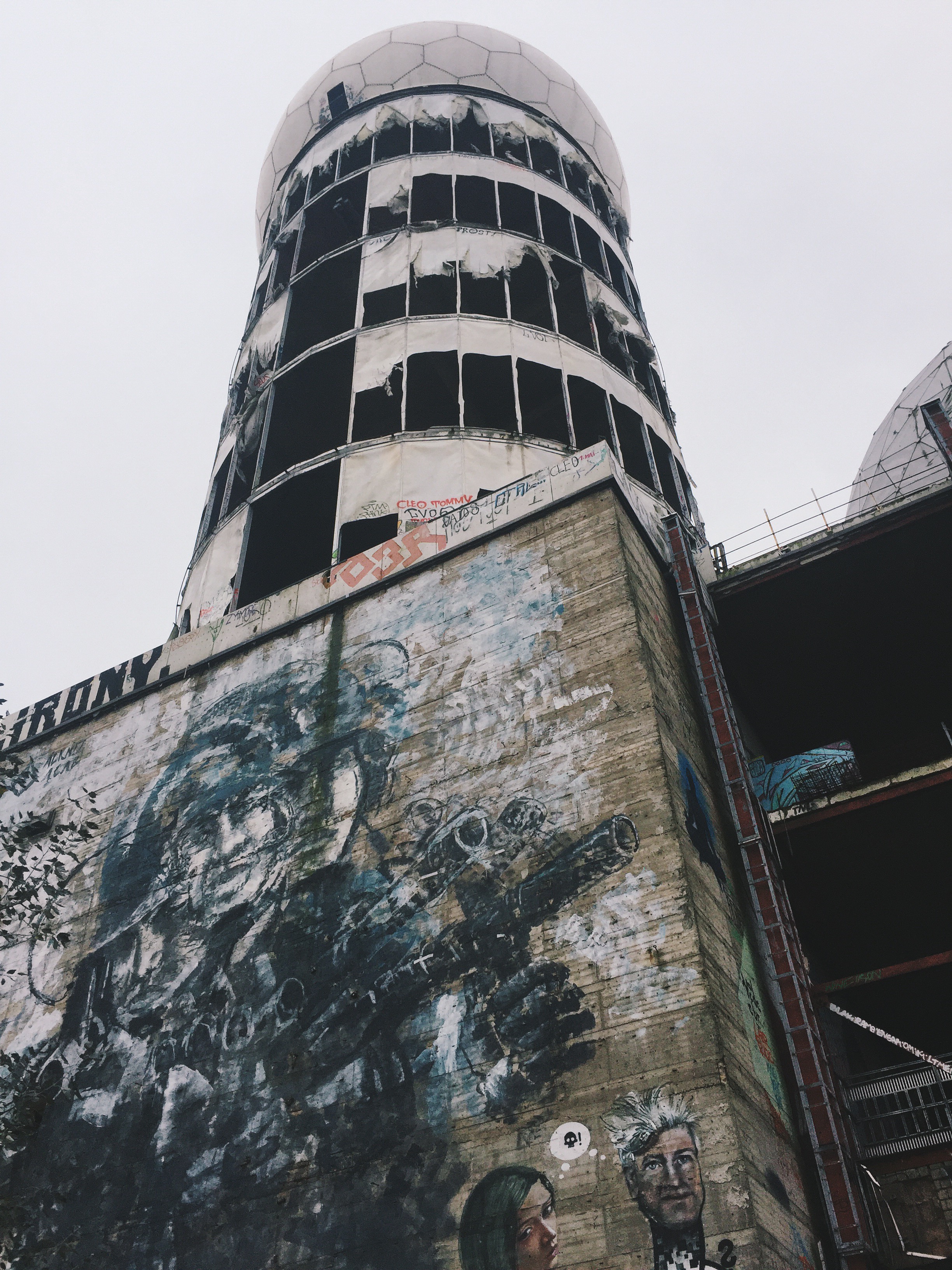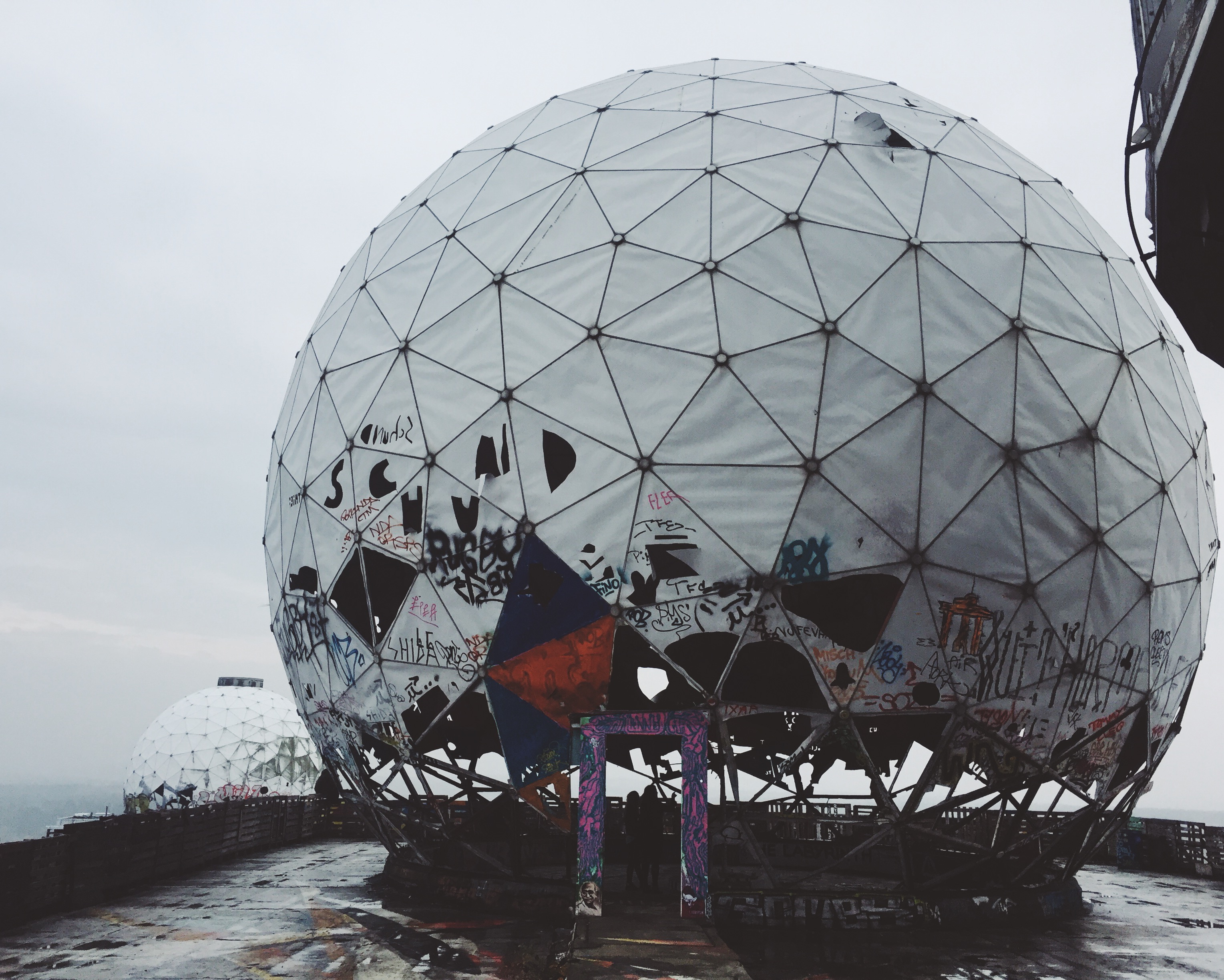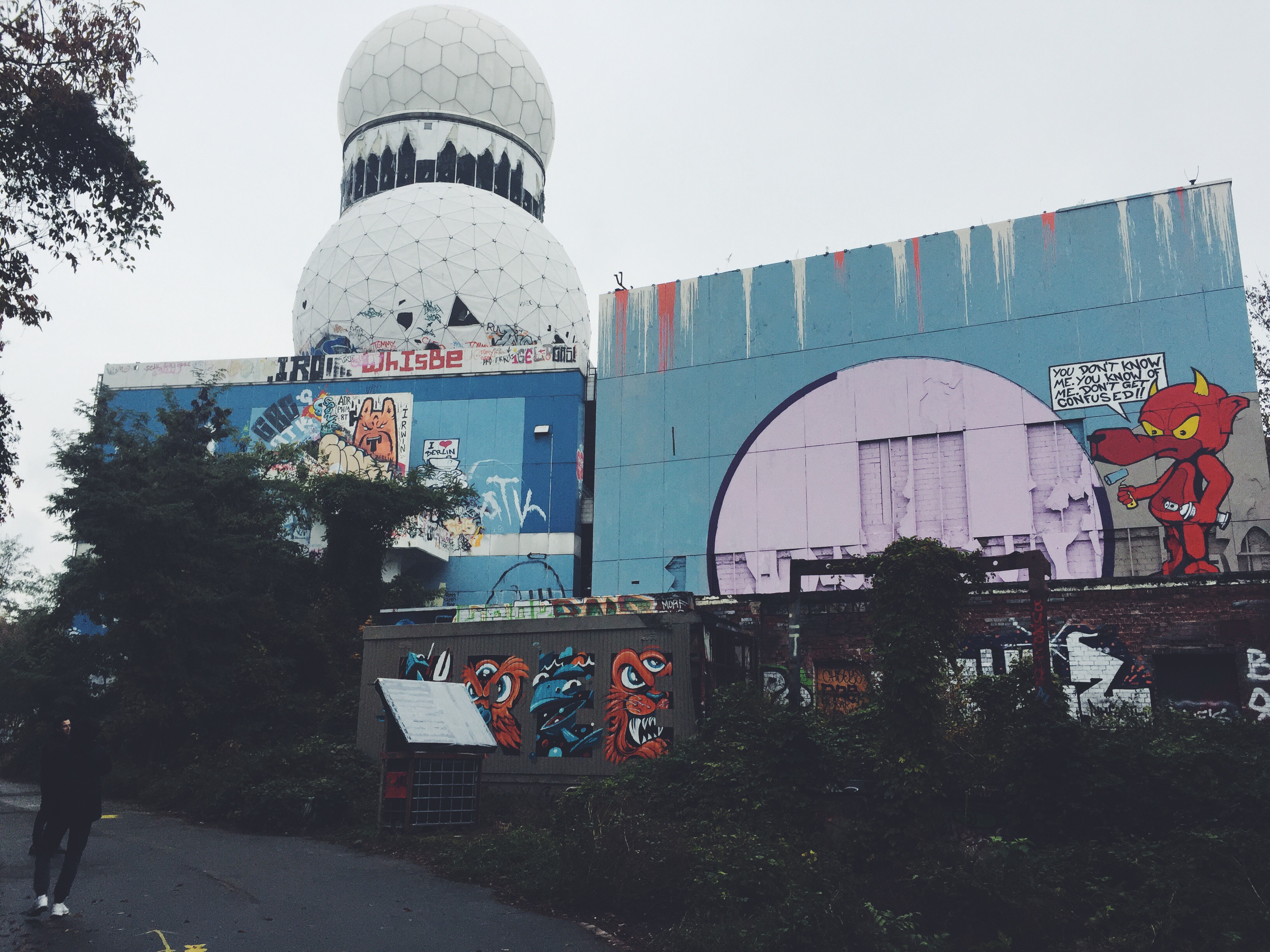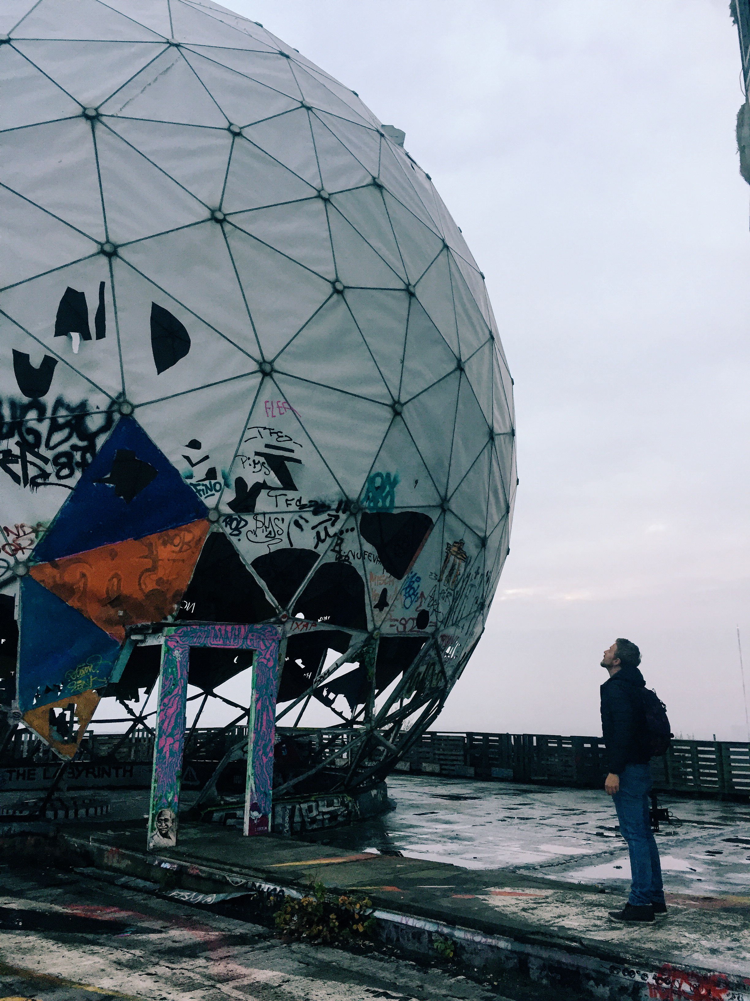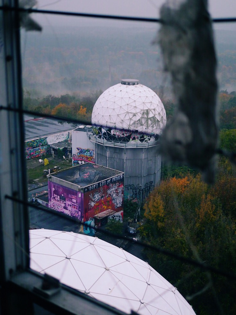 When we arrive late on a pretty miserable October afternoon, the place is drowning in an eerie silence. A thick, grey mist envelops the site. Peeking out of the mist from the top of the tower is the surreal view of these huge bulbous radomes (nicknamed by locals as ‘Berlin’s Balls’). Each of these domes contained massive 12 metre satellite antennas which at the time were the most sophisticated spying equipment .