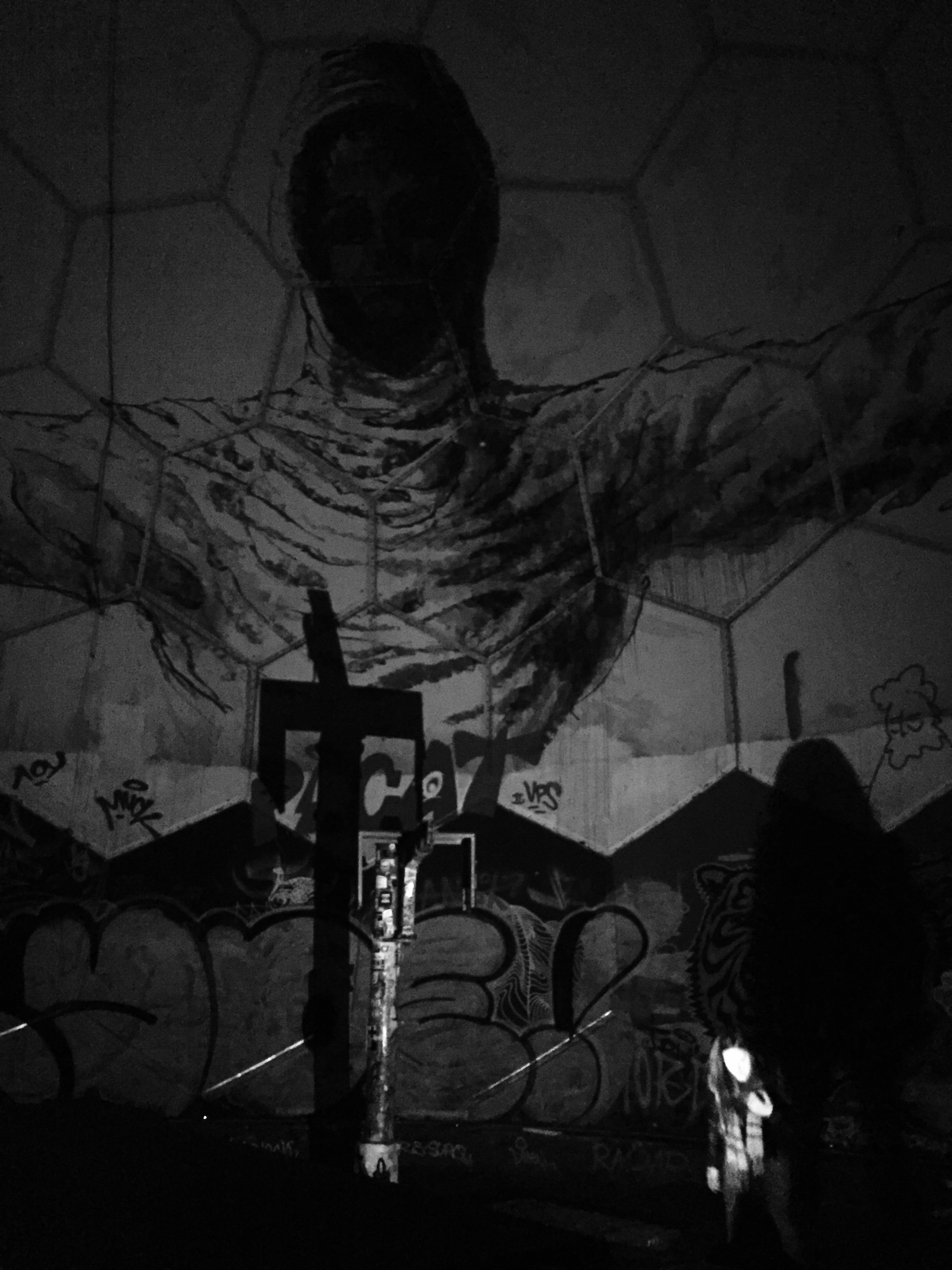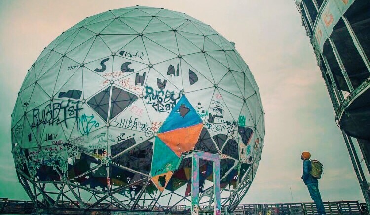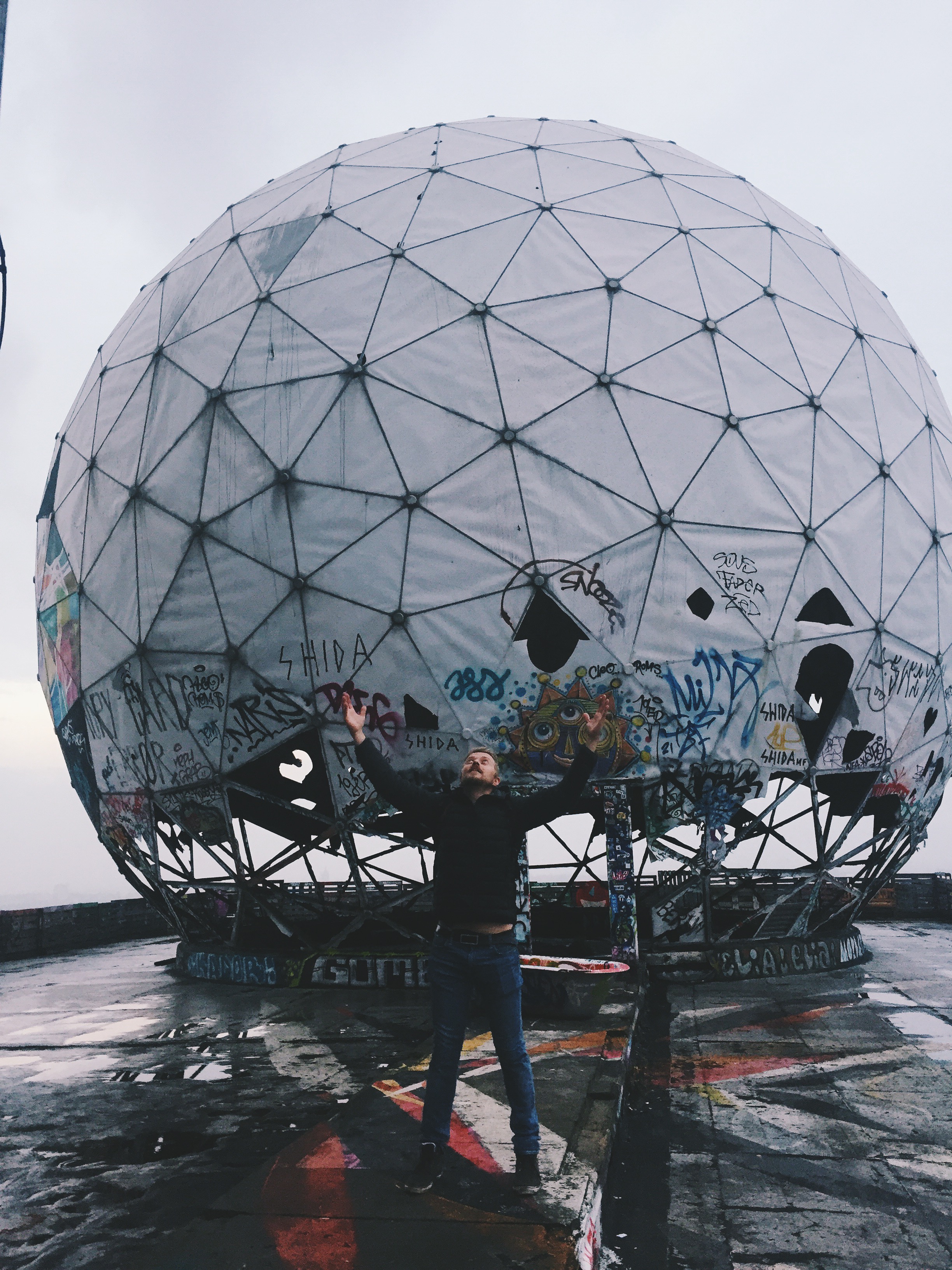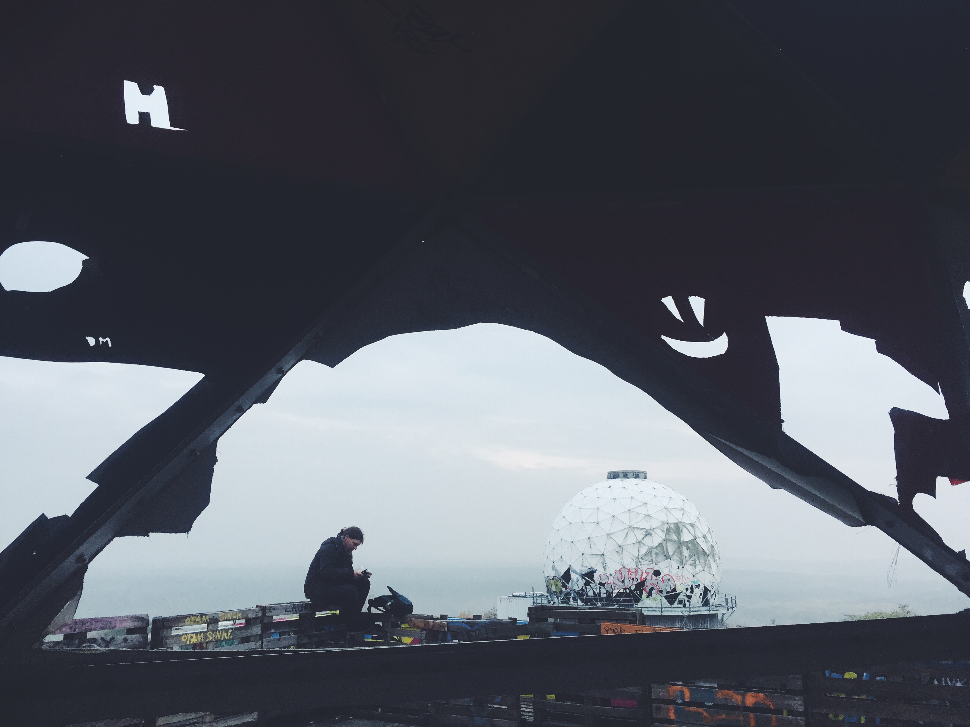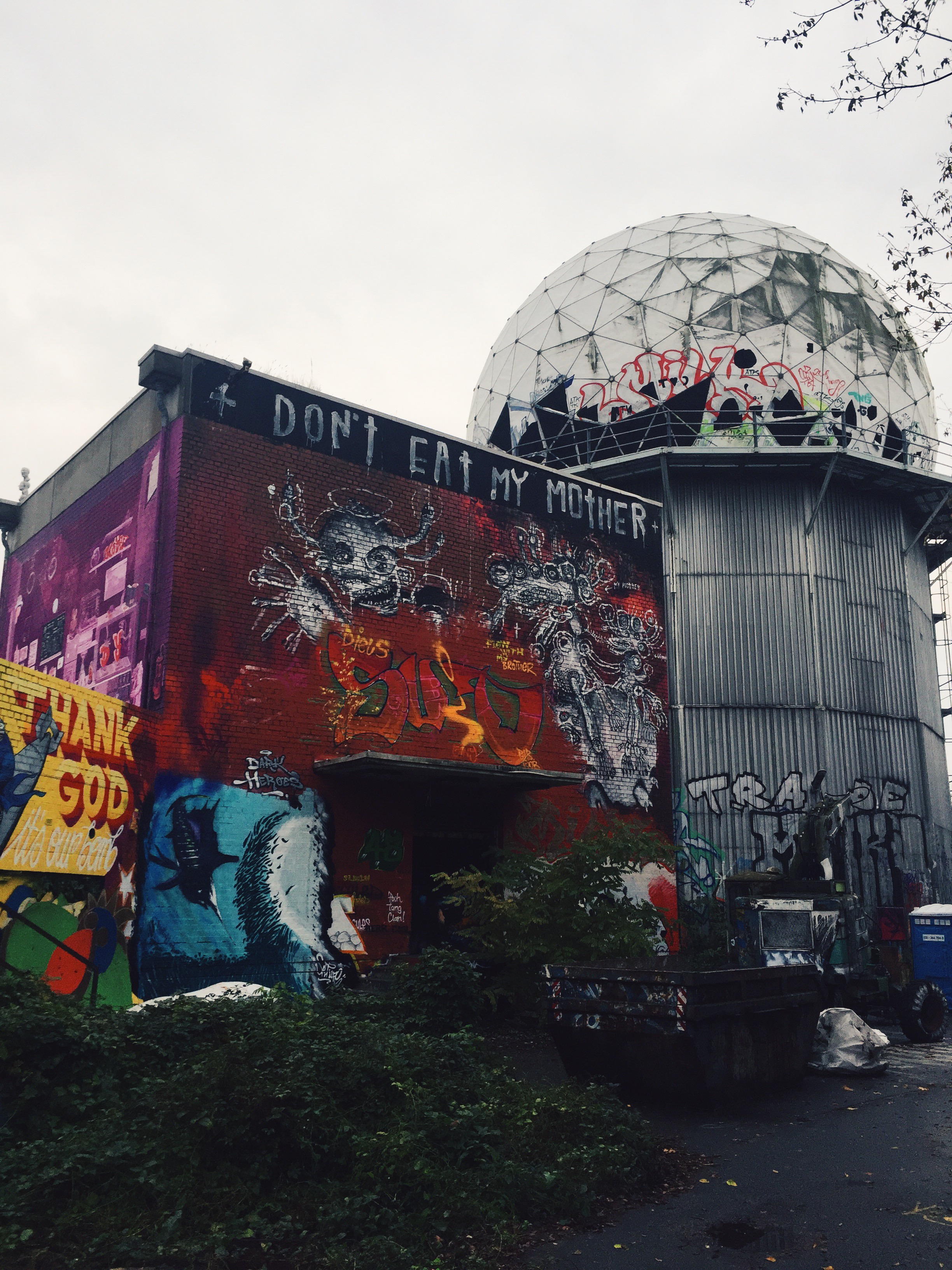 When we arrive late on a pretty miserable October afternoon, the place is drowning in an eerie silence. A thick, grey mist envelops the site. Peeking out of the mist from the top of the tower is the surreal view of these huge bulbous radomes (nicknamed by locals as ‘Berlin’s Balls’). Each of these domes contained massive 12 metre satellite antennas which at the time were the most sophisticated spying equipment .