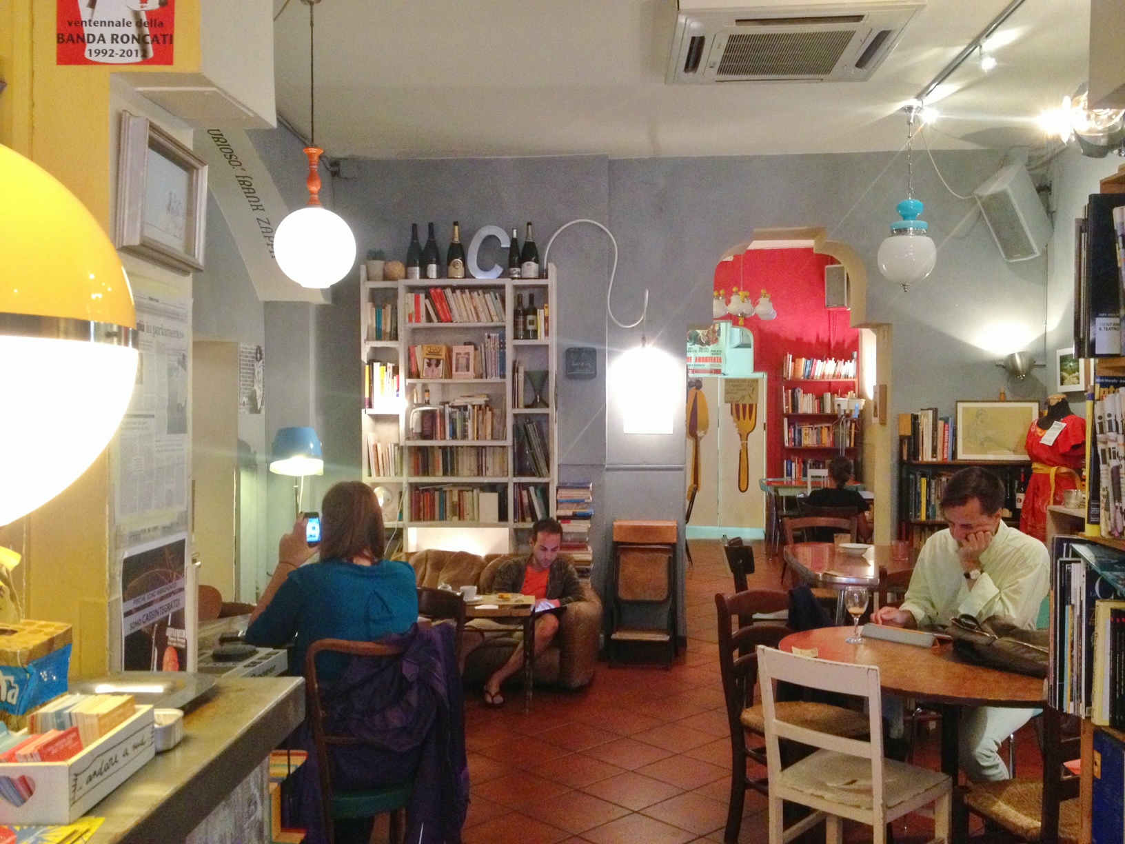 Walking into this cafe is like being ushered into a writers living room- books piled up from floor to ceiling, Miles Davis playing in the background, beautiful photographs of a chinese tea plantation , interesting quotes everywhere , wine crates doubling up as book shelves-interesting place.. where you could be happily stuck here for hours. Wine list is great, coffee one of the best in town ( cheap too, cortado I was drinking was just €0.90)and the free wifi excellent. Little secret places like this hidden away from the view of the world are what make Bologna such a charming place.