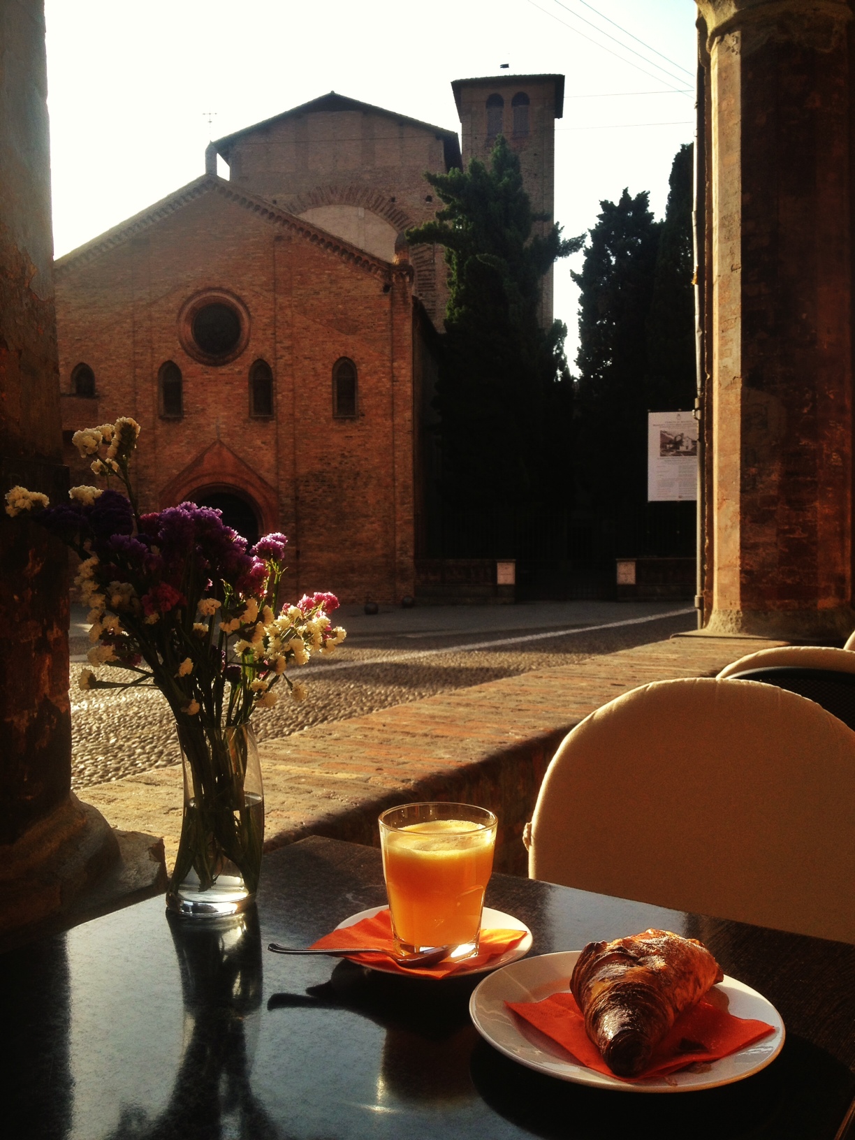 The perfect way to relax after the long walk is to have breakfast at probably the most scenic points of the city and watch the sun rise over the city. Devoid of the crowds, the Piazza Santo Stefano is one of my favourite piazzas in Italy with the beautiful church of Santo Stefano in the foreground, flanked by the beautiful colonnades. I settle down to a breakfast of a fresh orange juice and the crispiest, freshest salted croissant you could taste.