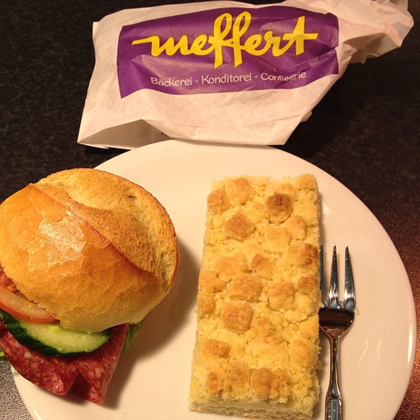 Late lunch. I pop into basement of Galeria Kaufhof near Kropcke to eat at Meffert, a local bakery that makes the local speciality: Schles Butterstreuselkuchen ( mouthful in itself to pronounce) With my herdbrotchen,the total cost of lunch came to just €3.85