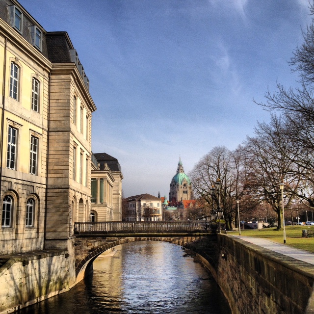 No, this is not Venice 🙂 This is the Leine Palace Bridge in Hannover, just around from the New Town Hall whose cupola you can see in the distance.