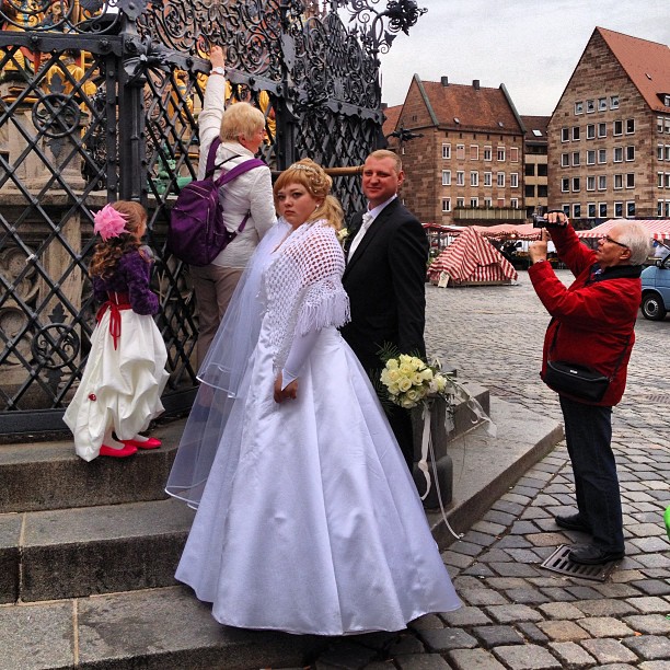 On my first trip to the city, I found a crowd of people gathered around a 19 metre long Gothic steeple known as the ‘Schoene Brunnen’ aka Beautiful Fountain. Beyond the usual gaggle of tourists, there is bunch of locals and a bride and groom.