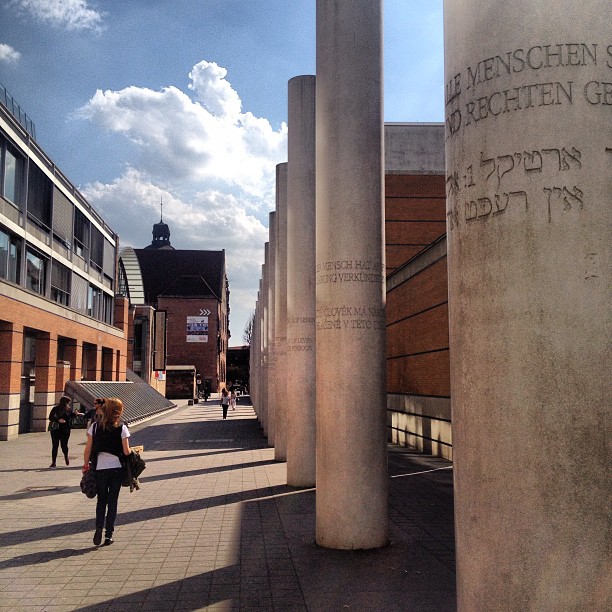 Each of the 8 metre high , 30 pillars have one article of Universal Declaration of Human Rights engraved in German and a 2nd language. The sculpture is part of Nuremberg’s effort to become a city championing human rights & move away from it’s dark past of being Hitler’s favourite city.