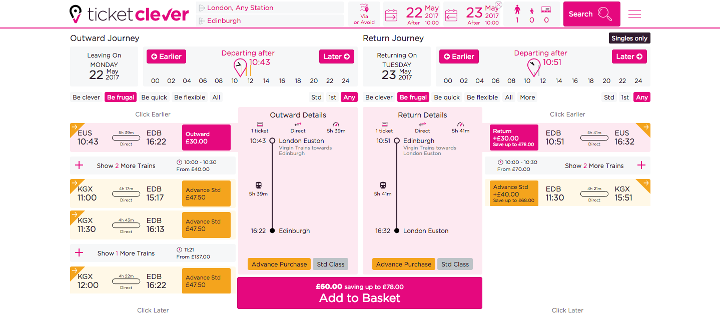 Here’s an example of London to Edinburgh return when booked as far in advance as possible – £60 saving up to £78.