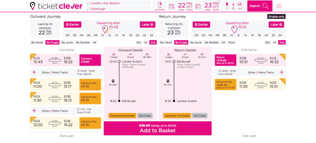 UK train booking site ticketclever.com combines multiple tickets on some longer journeys to save money even on the day – and they don’t charge a booking fee. Plus they also sell Advance fares and standard fares. I’ve said in the past never leave booking your train ticket till the last minute. I stand by that advice but if you do find yourself booking on the day of travel, it’s good to know that it is still possible to save.