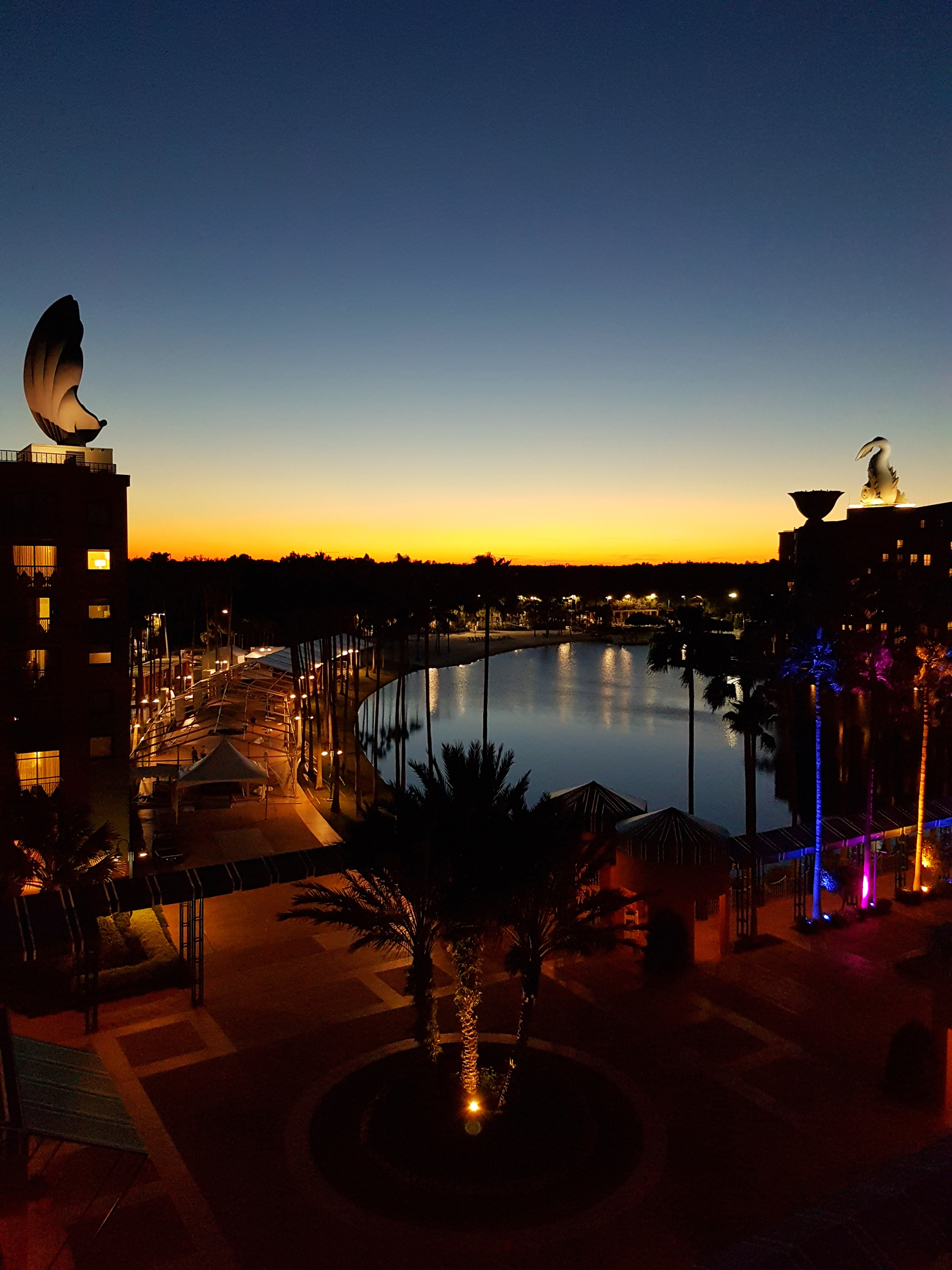 I check in to the Disney Swan & Dolphin Resort just in time for sunset. My balcony overlooks the pools and beach that circle the lake, burnt orange and ochre bleeding into a navy sky. Pure magic – pure Disney.