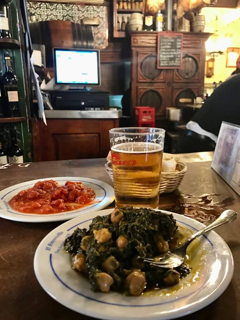 You can try the signature dish of Seville, espinacas con garbanzos. This dish sums up Seville’s rich history. The Moors were the first to bring spinach, chickpeas, and cumin to Spain and all three are the main stars of this dish alongside smoked paprika. My other favourite dish here is bacalau aka cod in a tomato garlic sauce-heavenly stuff!