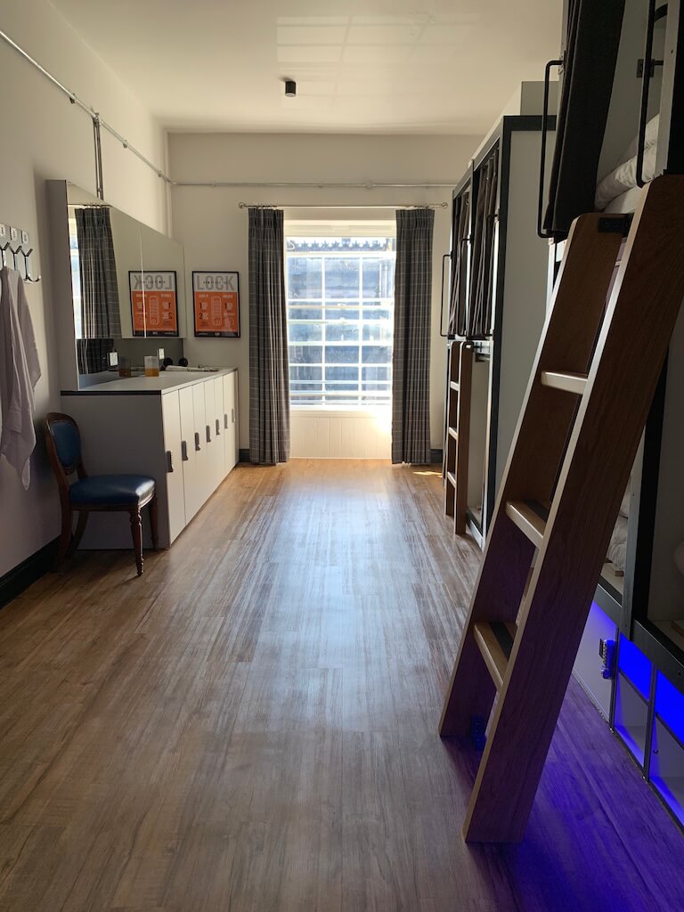 The rooms are a mix of privates, some with ensuite facilities plus their signature luxury Pod beds in the dorms. The former cells where inmates were held have been converted into privates. The privates here are snug with cosy, clean beds ( great mattress) and also thick quilts and an added woollen rug for extra comfort. The first night I stayed in a private with ensuite bathroom- the bathroom was on the small side but functional with a very good rainshower. There’s plenty of space to store your bags under the beds and also built in cupboards.