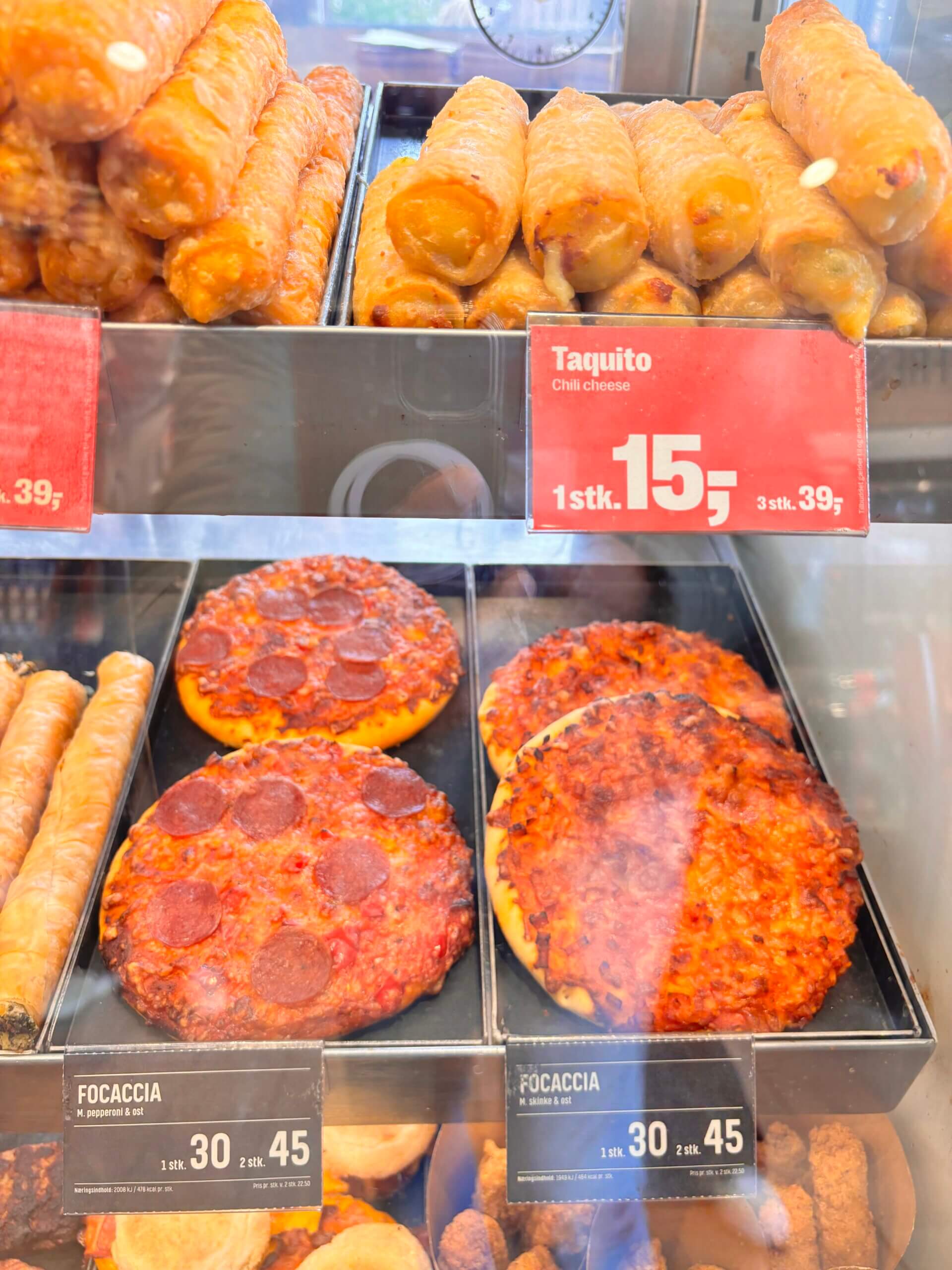 The Netto supermarkets also have a range of snacks like Frikadelle ( 1 piece- 22 DKK €3) and also small focacacia pizzas for 30 DKK ( 2 for 45 DKK)