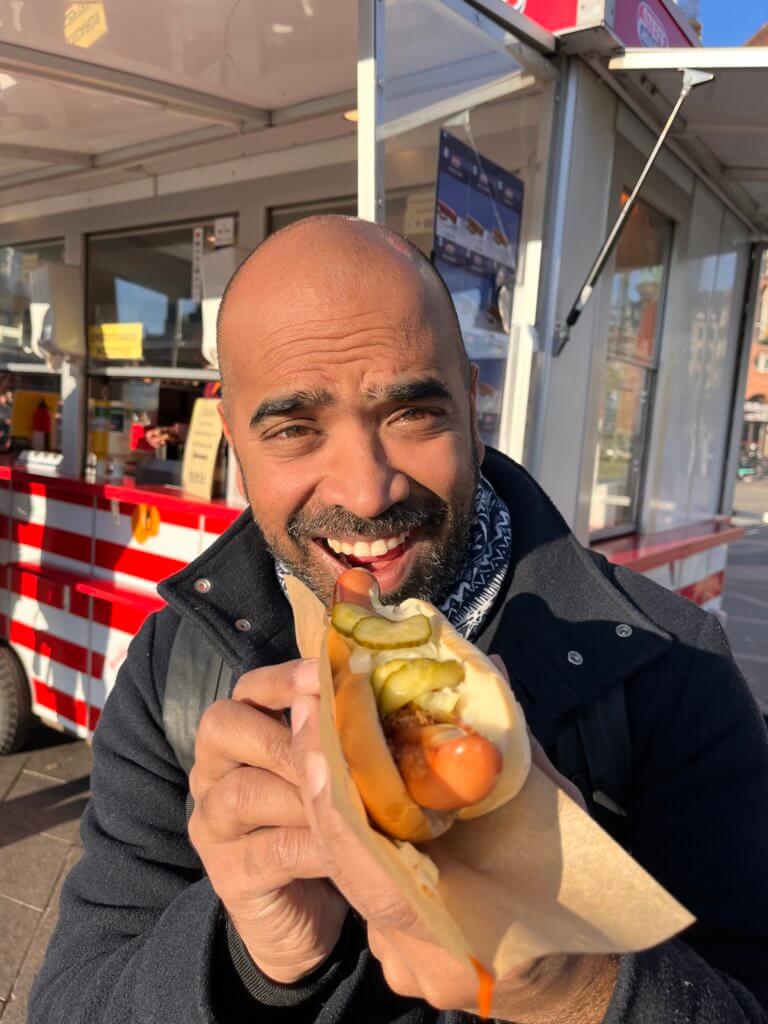 Update: ( October 2023) I had the chance to finally try ‘The organic sausage man’ aka Den Økologiske Pølsemand which is right by the Round Tower in the city centre. I tried the standard ‘Roasted Hotdog’ ( 42 dkk ) -organic pork sausage in a wholegrain bun. What elevates this offering are their delicious sauces- pickled mayonnaise, honey mustard and ketchup which is then topped off with raw and fried onions plus sliced pickles. It is delicious and definitely worth trying. I have heard great things about the vegan version and next time in Copenhagen, I will try that.