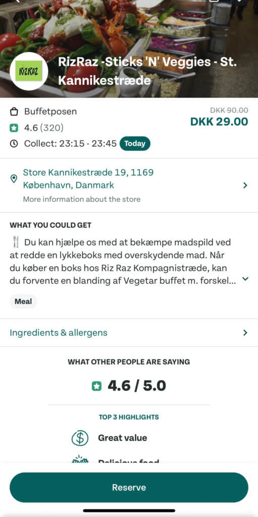 Example of a deal- for example, today, searching in CPH, you can pick up a bag of food from the RizRaz buffet for just 29 dkk! Brilliant deal.