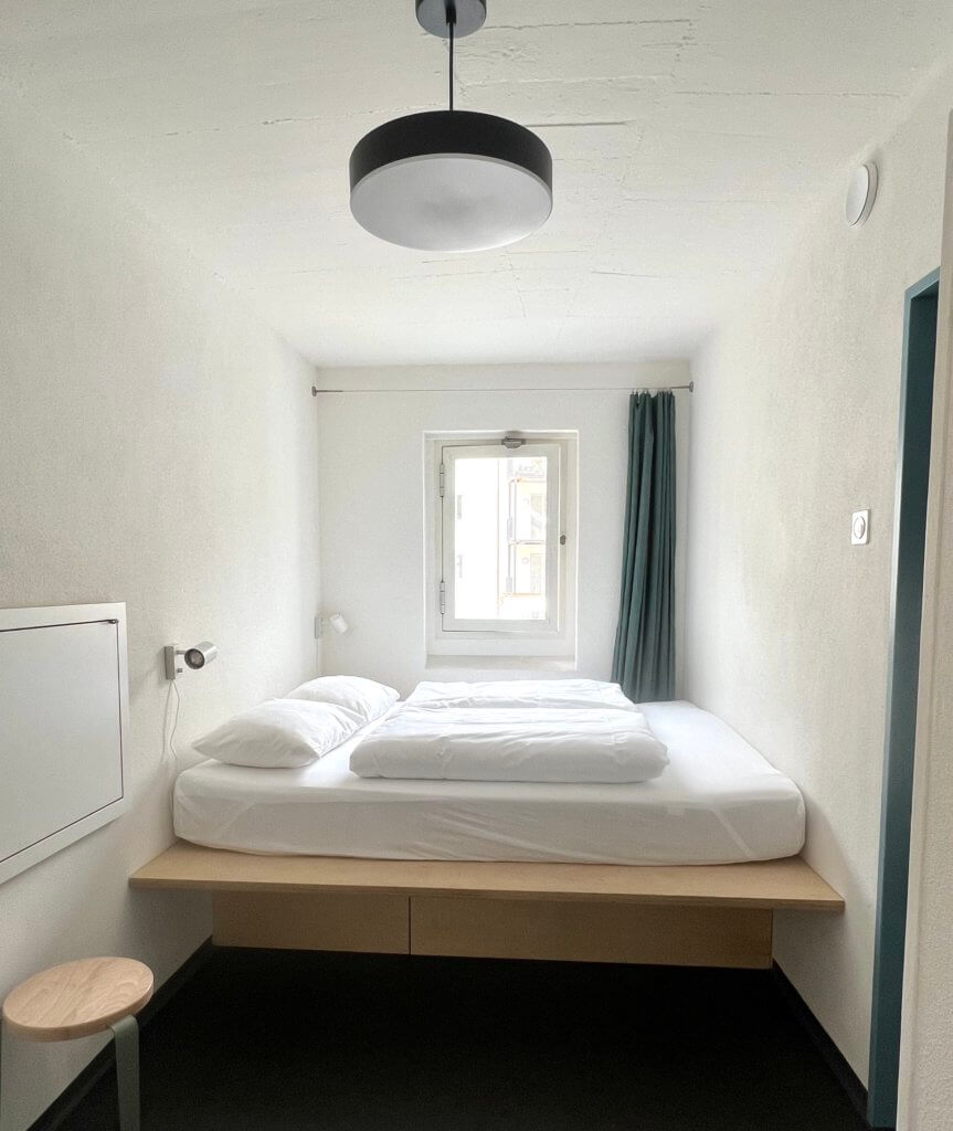 Switzerland’s hottest new design hostel, Bogentrakt Hostel is located in the picturesque town of Chur, the oldest inhabited town in Switzerland. Home to the “toughest prison in Switzerland”, owner Marco Leibundgut has transformed it into a vibrant hostel, giving the historic building a new lease of life.. The hostel’s name, “Bogentrakt,” a German word that translates to “curved wing” or “arched wing” pays homage to the prison’s distinct curved structure which gracefully merges with the surrounding landscape. The large windows in the corridor allow ample natural light to flood the interior, creating a warm and inviting atmosphere. Old, former prison cells have been tastefully converted into modern rooms. The rooms have folding tables, shelves so guests can maximise use of space. Visitors can learn about the colourful history of the prison and former inmates via QR codes and pictures which are visible throughout the hostel. The cell doors and the intercoms in the individual cells have been retained to give an authentic feel.