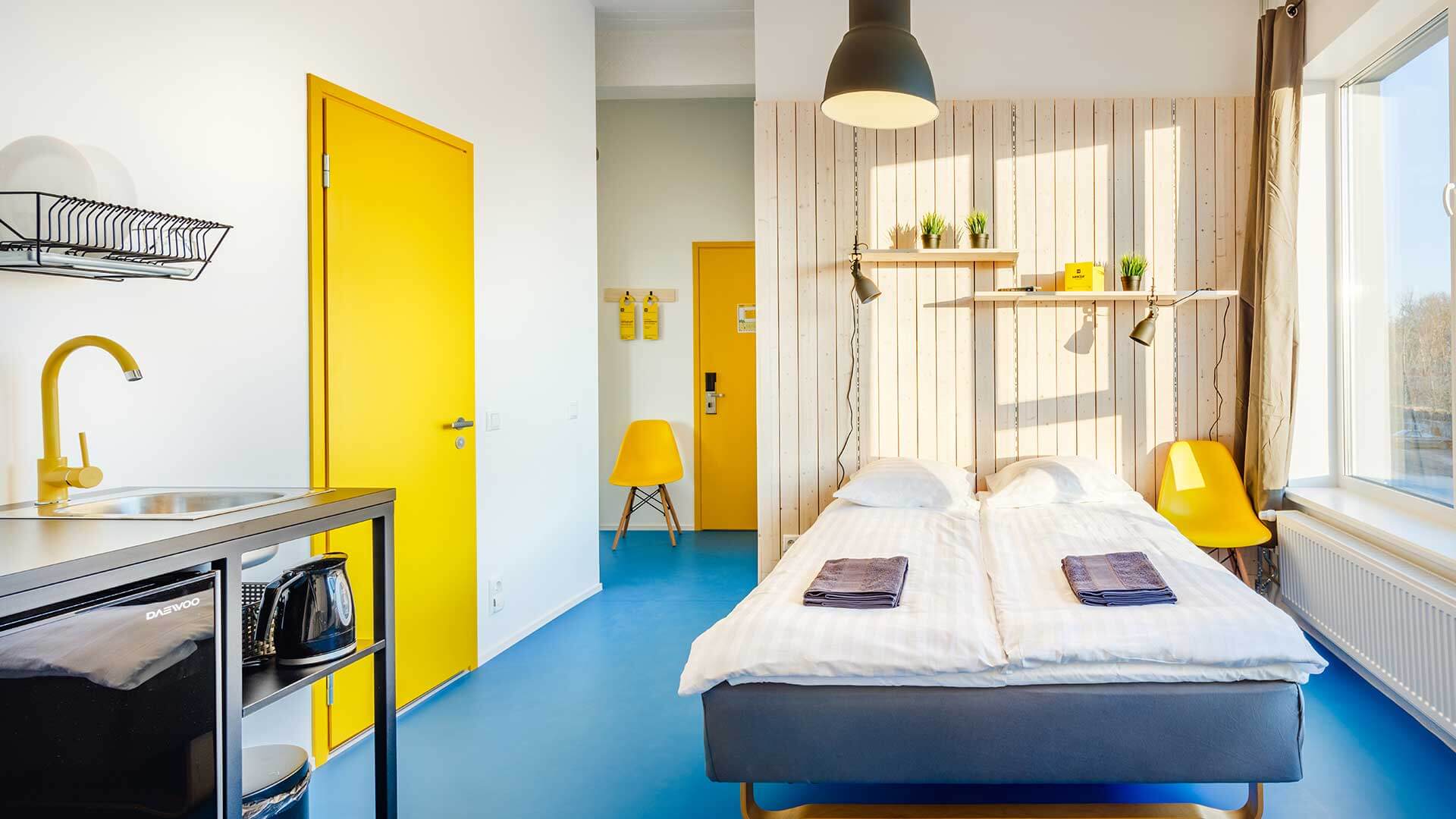 The hostel has been converted into an inviting and convenient living space from an old commercial space dating from the 1950s. Launched in 2016 with 112 rooms, the hostel’s impressive amenities include a high-quality lobby café which is perfect to work from or their meeting rooms plus there is a library, guest kitchen, gym and jacuzzi, laundry and ironing facilities. The rooms at Hektor have been furnished in a modern and sophisticated manner – a minimalistic interior design is balanced with eye pleasing colours, natural wood, high quality comfortable beds, kitchenettes and private bathrooms. Guests also benefit from a 24/7 reception, free wifi and parking, a variety of extra services which include a generous breakfast buffet.