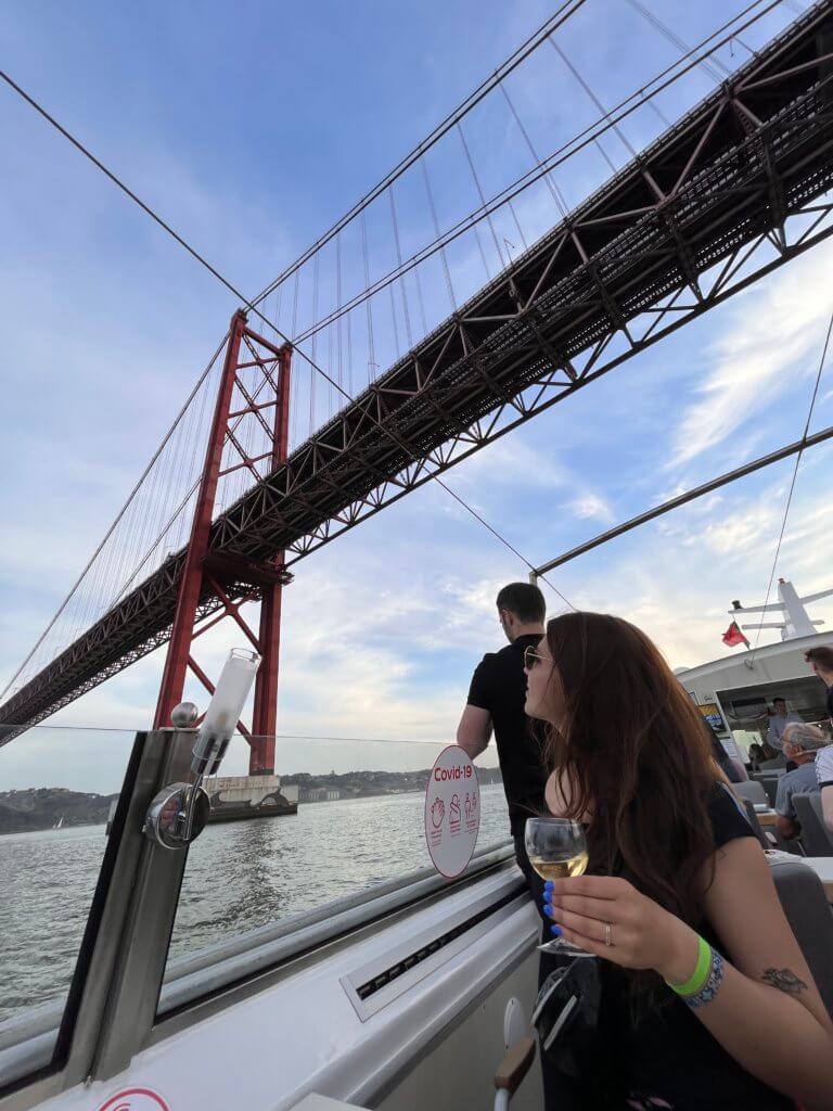 The weather was perfect for the sunset cruise. Clear skies and light was perfect. The cruise boat departed from Terracio do Paco, right next to the majestic square, Praca Do Comercio. We were advised to come early to board, 20 minutes before departure and already found a sizeable number of people queuing up. Tip: If you want to guarantee yourselves a nice seat, try and come a wee bit earlier. The boat itself, was a modern convertible boat with a roof that closes in case of bad weather. It is a nice size and roughly accommodates 70-80 people so it didn’t feel overcrowded, even at full capacity. The cruise had a nice mix of people from all parts of the world. Behind was a family from Philippines who were celebrating the last night of their Portugal trip on the boat. Beside was a stag group from Bergamo- well behaved and nice guys, not your usual stag group type. Thank lord. The cruise lasted 1.30 hours and takes you to some of the most prominent landmarks visible from the river that include Ponte 25 de Abril, the Museum of Art, Architecture and Technology (MAAT), Padrão dos Descobrimentos, the Belém lighthouse, the Belém Tower and finally the Santuário de Cristo Rei. The cruise goes at a slow pace so you can really admire all the landmarks really close and upfront. One of my favourite parts of the cruise is when it dips beneath the broad, majestic expanse of the red rouge Ponte 25 de Abril. You can hear the hum of cars and trains passing above and then to the left of the bridge, the classic view of the Cristo Mei statue- really something special. Another magical moment is when the sunsets and it slowly turns dark, the ship does another spin and repositions itself slowly in front of the Cristo Mei statue. With the moon glowing behind it, wow, it really looked magical. Altogether, the time on the boat seemed to fly by quickly. Maybe it was the wine but it is a really nice way to wind down after a long day of sightseeing or maybe it marks the beginning of an epic night out in Lisbon.