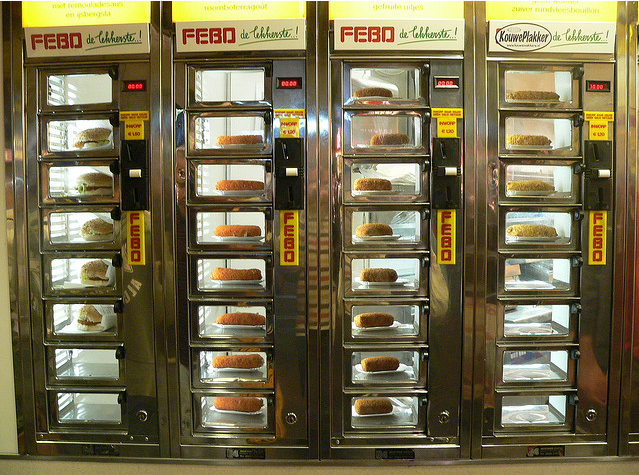 It would be sacrilege to write about budget eats in Amsterdam without mentioning Febo, the chain of vending machine style fast food restaurants that locals love to hate and hate to love, especially at 4am in the morning and they’ve just been kicked out of a closing nightclub. Surprisingly tasty fast food snacks ranging from burgers to the Dutch specialties of frikkandel (minced meat hot dog) and krokets all available at the deposit of a couple of Euros and the push of a button. As unappealing as it may sometimes look, FEBO de Lekkerste (which means FEBO The Tastiest) must be doing something right as it has 22 branches across Amsterdam.