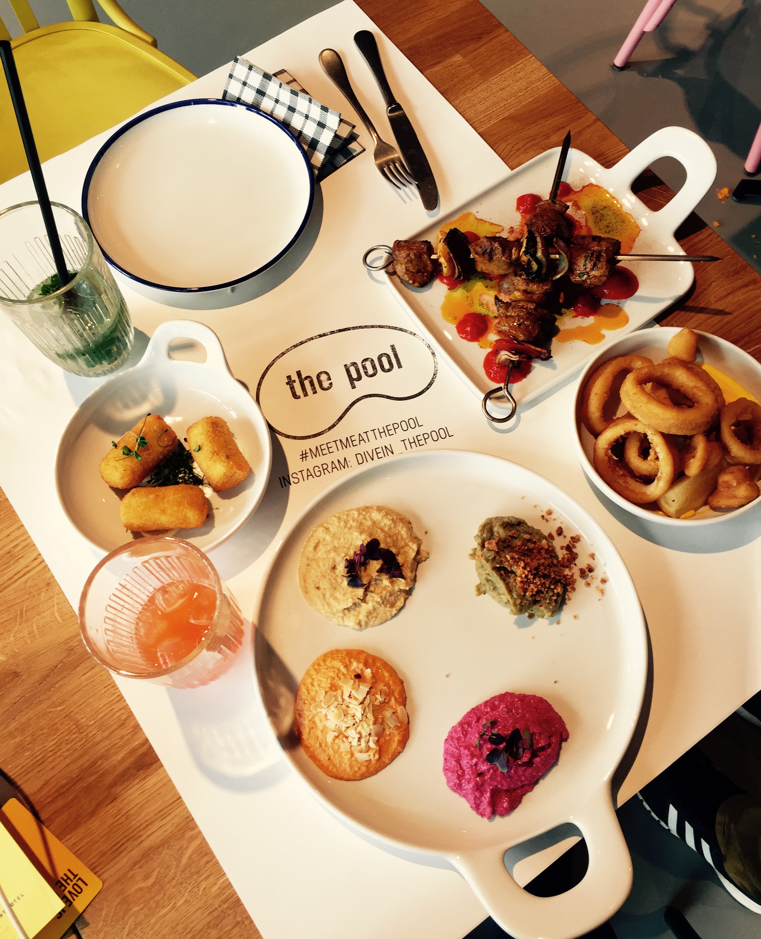 Situated in the lesser known but increasingly hip Amsterdam East on Wibautstraat is the Miami inspired ´Pool restaurant´(Wibautstraat 131-A ) The resto is part of the new Student Hotel, a budget boutique hotel that is one of my favourite budget accommodation picks in Amsterdam alongside Clink Noord, Cocomama and the recently opened Ecomama boutique hostel. The restaurant has a very cheerful and colourful vibe. Staff are attentive and friendly. Cocktails The food itself is affordable and shareable. Everything we ordered was delicious. Highly recommend their Iberian style croquettes served with aioli (€4) Baba Ganoush and Hummus ( €5 each) spanish empanadas (€5) If you´re looking for a bigger plate of food, their pappardelle ragu (€11) or the citrus chicken with couscous is a winner.