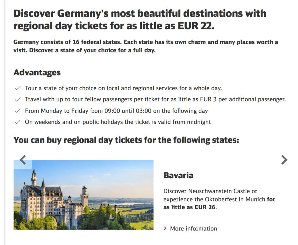 If you are visiting Germany, especially with your partner or a group of friends, another brilliant deal is the Lander regional tickets which offer you unlimited travel within the state for as little as €22. This ticket is valid only on local and regional trains and excludes the faster ICE/IC trains. You can travel with up to four fellow passengers per ticket for as little as EUR 3 per additional passenger.