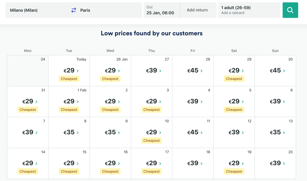 PS: Another brilliant value train deal to also keep in mind is the Milan to Paris route. Being offseason, there is a bunch of their cheap €29 fares on sale now on the route ( Trainline’s excellent low fare calendar is a very handy tool ) Journey time is 7 hours. Extra €10 snags you a seat on 1st class.