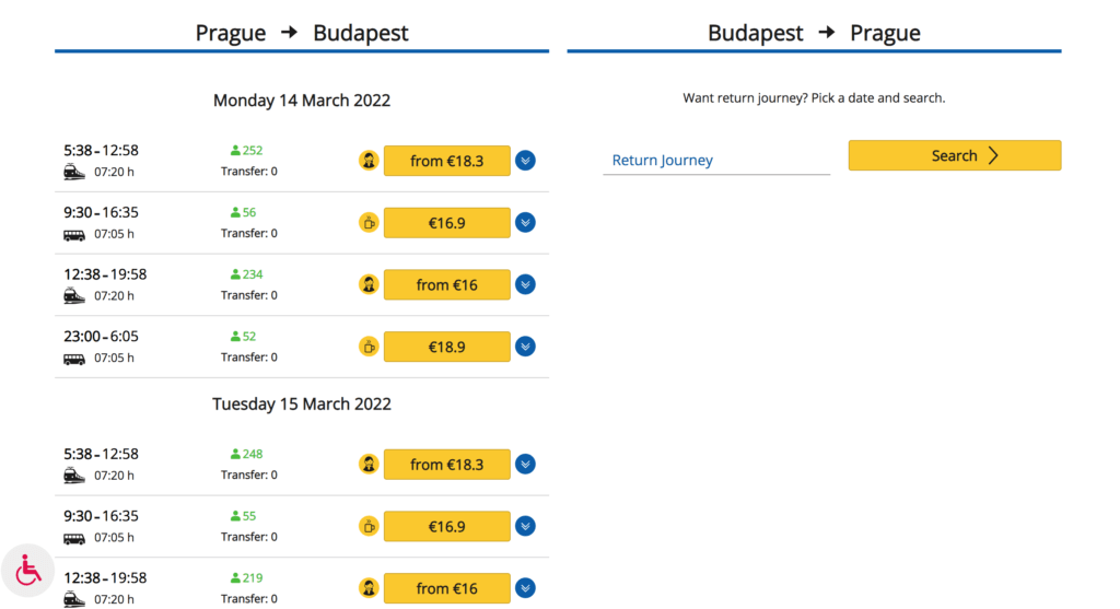 A quick search pulled up a few of the €16 Prague and Budapest fares in March 2022. The basic fare includes seat reservations and WiFi. For an extra €2.30 you get a better seat, free newspaper water and access to their built-in LCD screens.