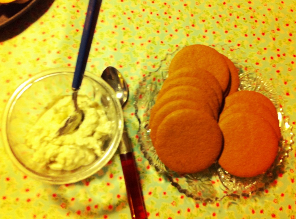 After sampling some of the delicious cookies , I was encouraged to try the cookies with the unusual accompaniment of some sharp blue cream cheese.