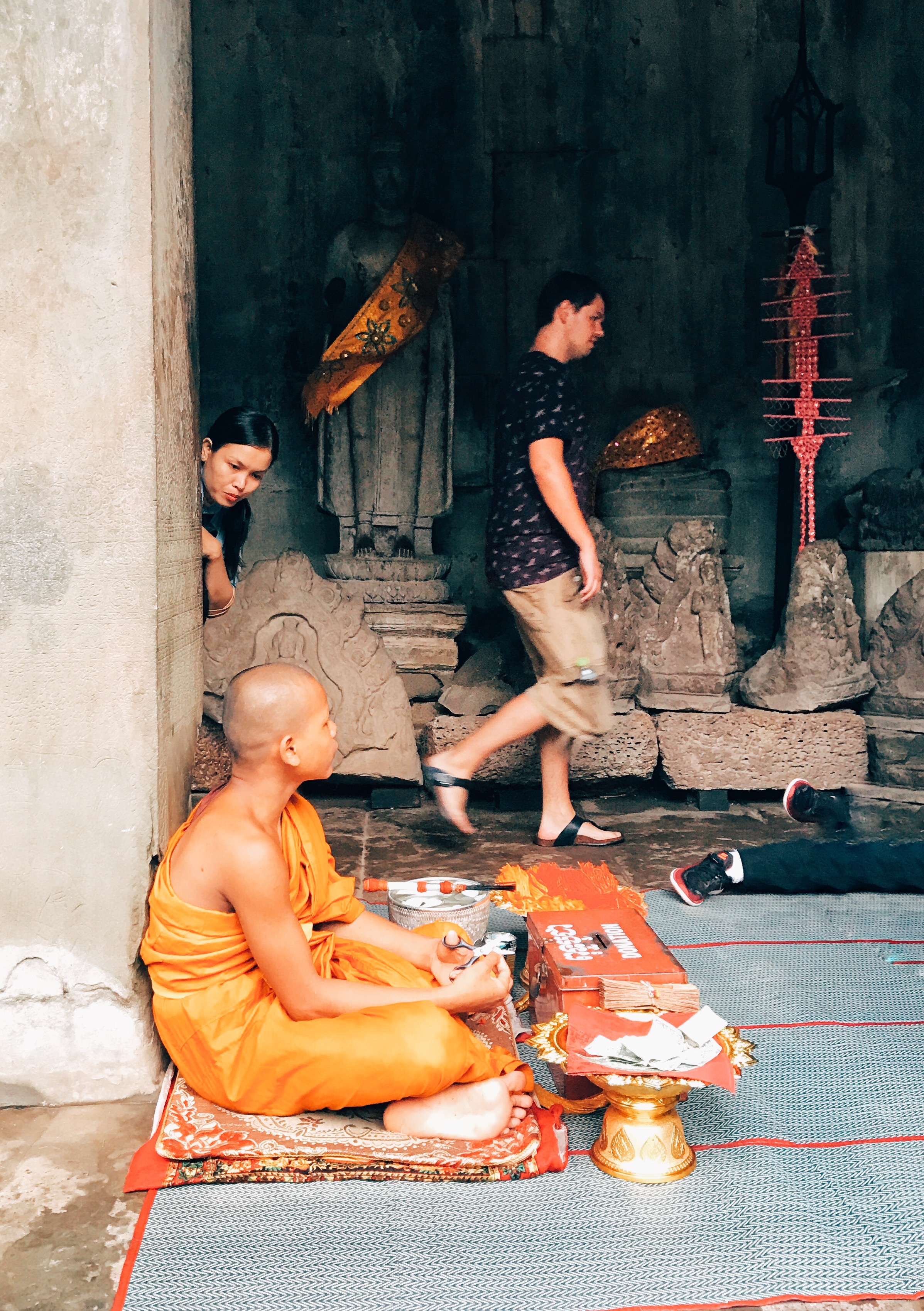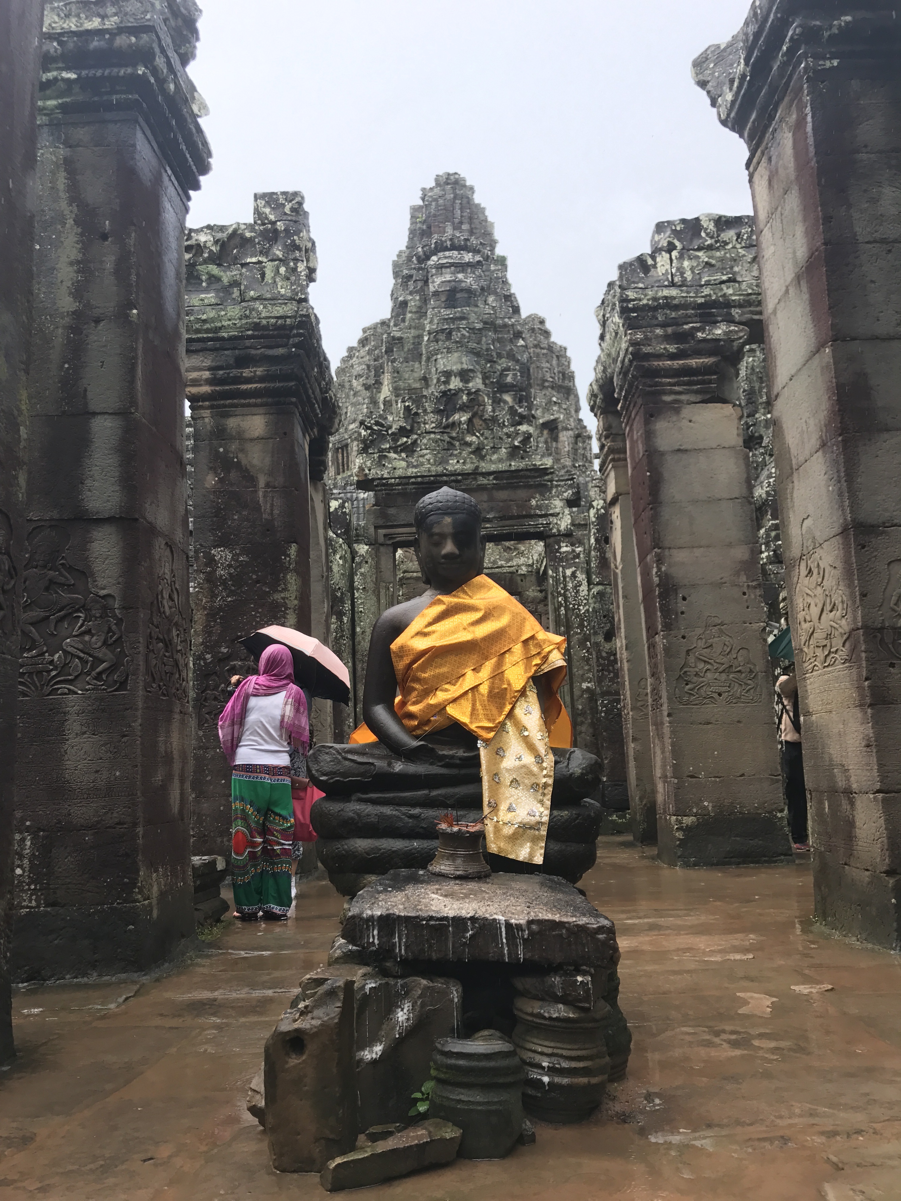 Not much of an early morning person but getting up early for sunrise at Angkor Wat is, I guess, one of those once in a lifetime experiences you have to savour. So, at 4:30am I was up and heading towards the temple. After a not too long queue to get our day pass to the temple, we made our way through the dark into the vast temple complex. Sadly, we were not the only people who had made the effort to get up at the crack of dawn to see this. At times, I have to be honest, the whole experience felt a bit hollow, standing there with a bunch of people wielding their selfie sticks around me with no sense of personal space. On top of that, given the cloudy weather, I did not see any sunrise. Even worse, it started raining heavily which is a risk you take visiting these parts in the monsoon season. Tip: my advice would be to visit these parts from November till March which is the dry season but on the downside this time of the year attracts even more tourists.