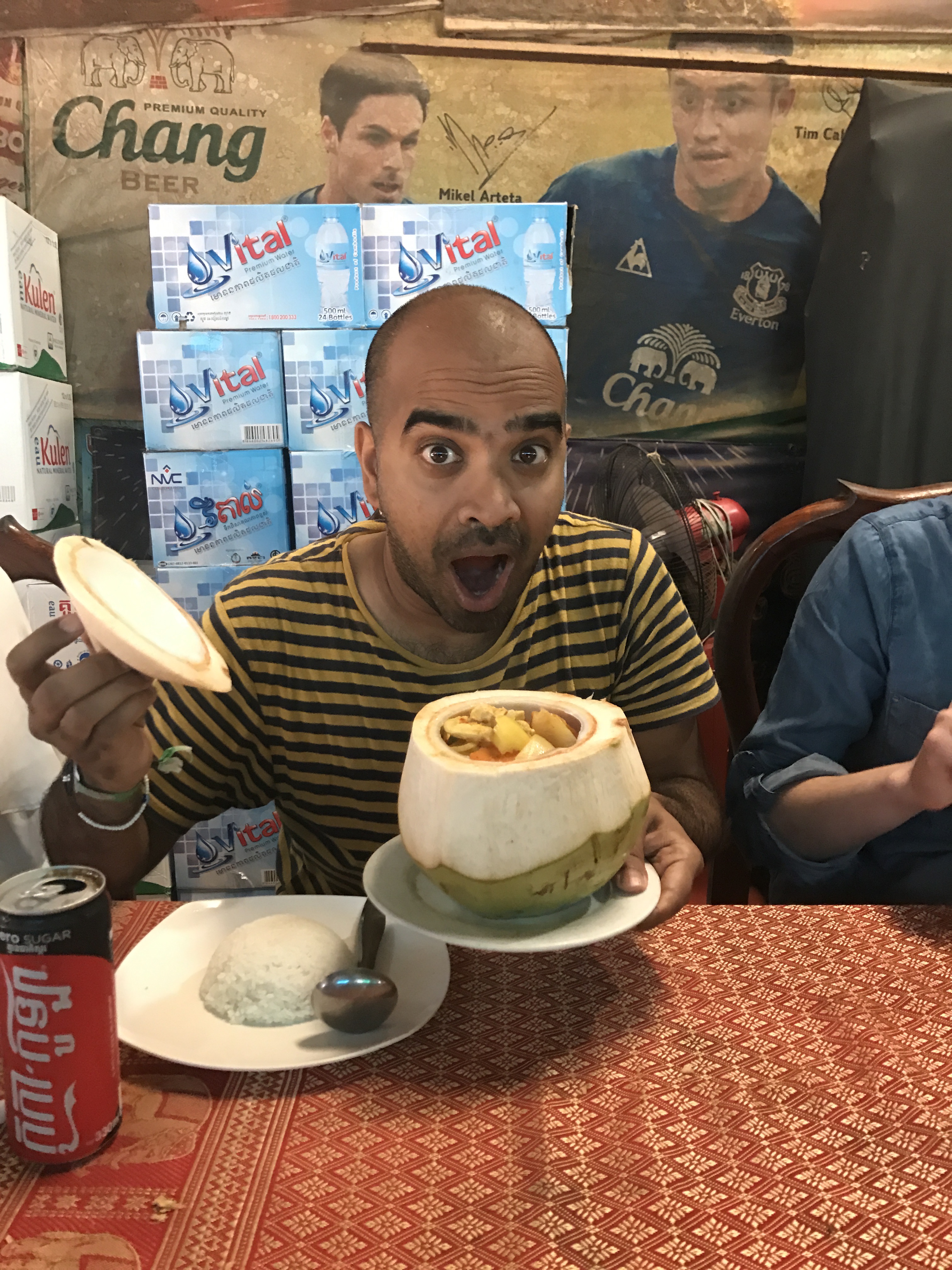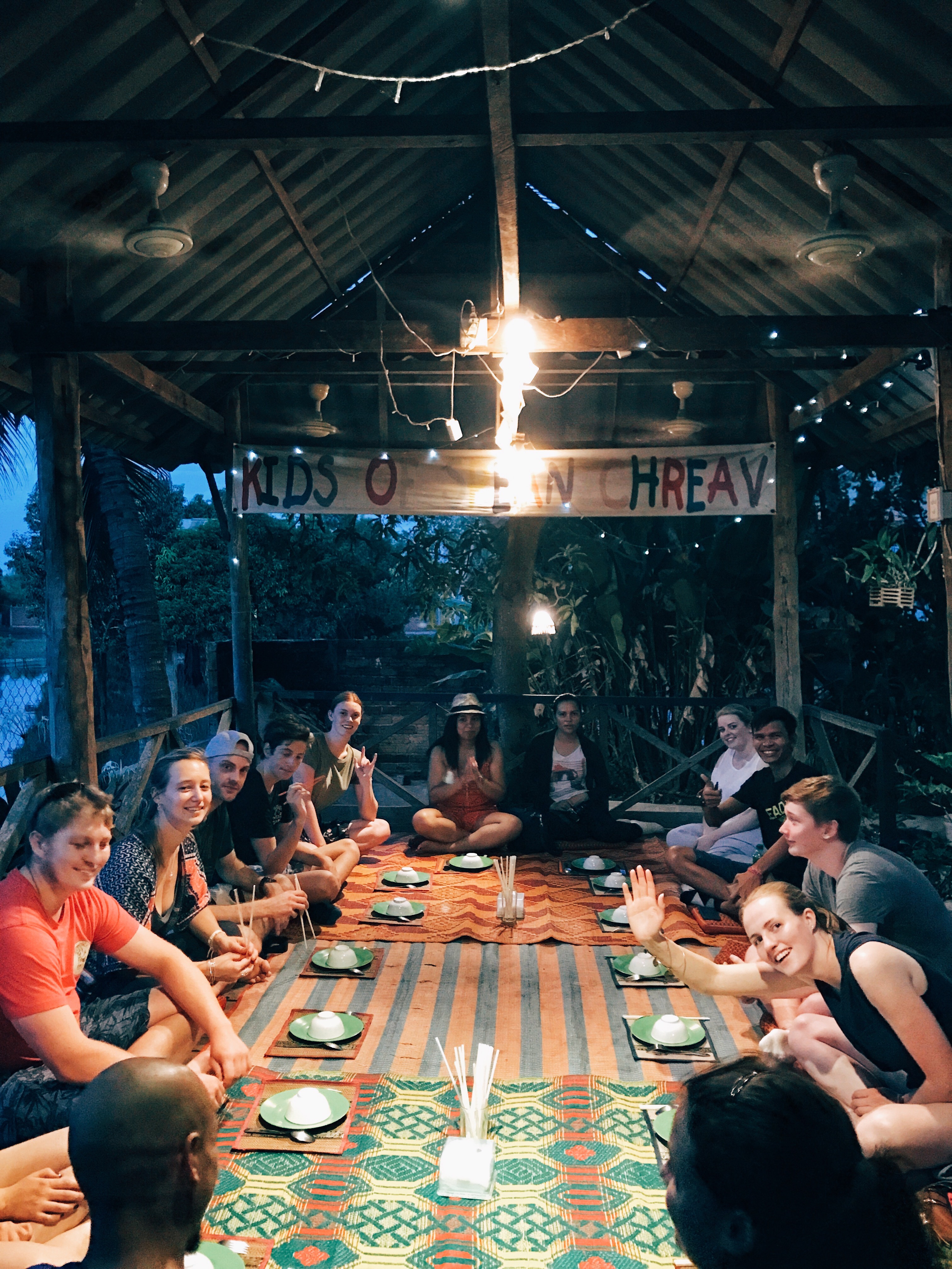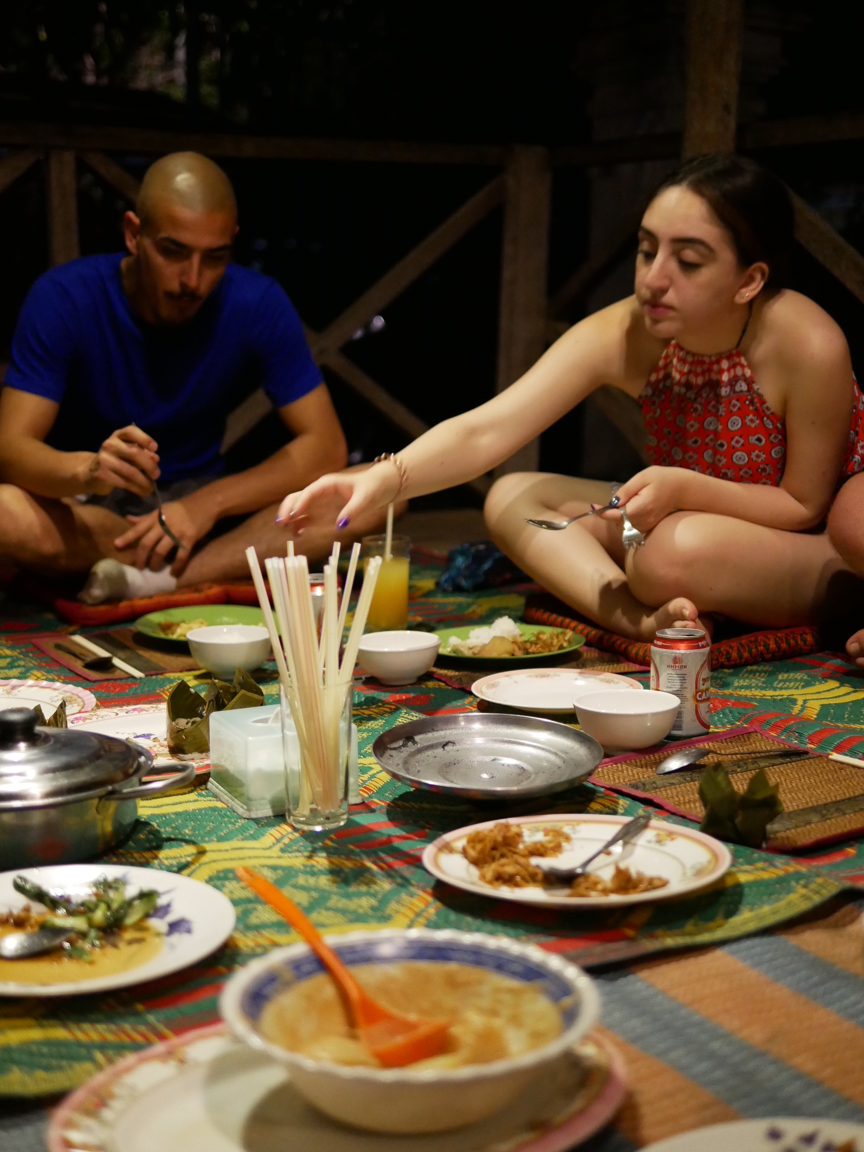 Finally the food arrived and this was a spread befitting a king and queen! We sat down on the floor which was a challenge for some people in the group. Coming from an Indian family, eating on the floor is something I’ve experienced and so I easily gorged on the food sampling traditional Khmer dishes like cha kngey ginger and chicken stir fry and fish amok: a thick soup cooked with fish, coconut milk and flavoured with chopped chillies, garlic, lemongrass, kaffir lime leaves and shallots. It was a really delicious meal and one of my standout memories of the trip.