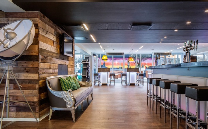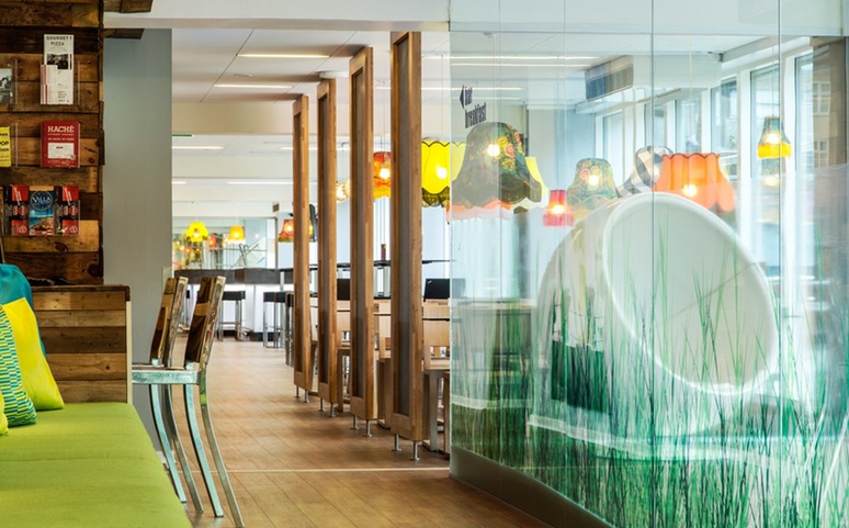 The first floor is a comfortable social space decorated with illustrations from Tim Bjorn and Jon Burgerman. The lounge area on this floor is illuminated with natural light from picture windows, decorated in a loft-style with Scrapwood Wallpaper from Piet Hein Eek. The chill-out lounge also has a cinema area, pool table, arcade games, and darts. In the lobby, brightly coloured lampshades hang above pool tables to create more unique spaces to chill. Local Scandinavian brands supply the furniture. The design can best be described as Scandinavian minimalist with pops of colour to add a modern touch.