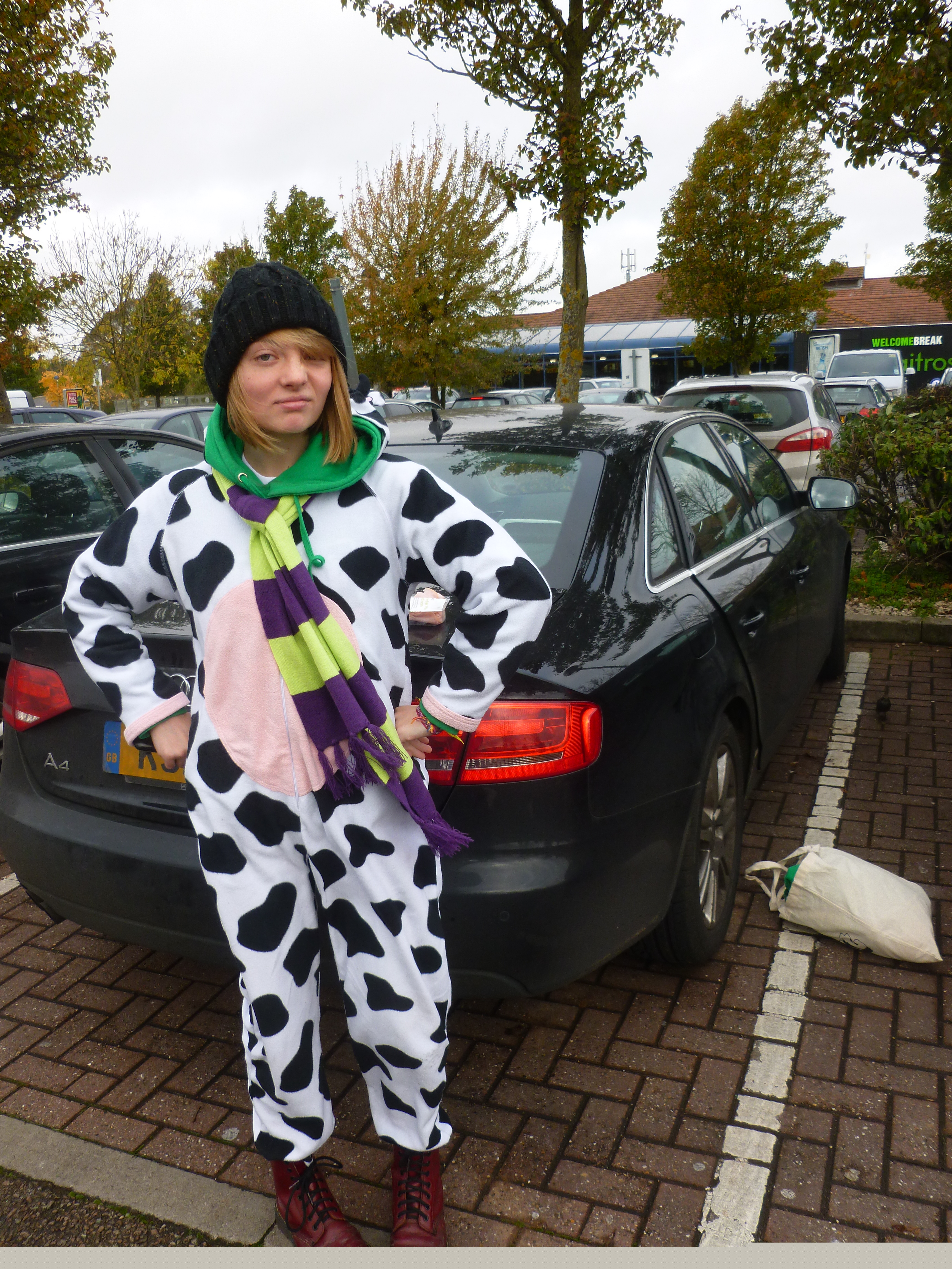 It attracts attention and makes you seem less threatening. Onesies are a brilliant costume – what driver is going to think someone dressed in a cow suit is dangerous or threatening?