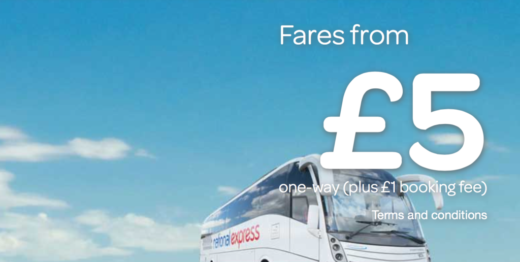 Low cost bus company Megabus are currently offering 20000 seats for free on their UK network between the 9th January 2017 and the 9th February 2017. National Express offer £5 one way fares on many of their routes.