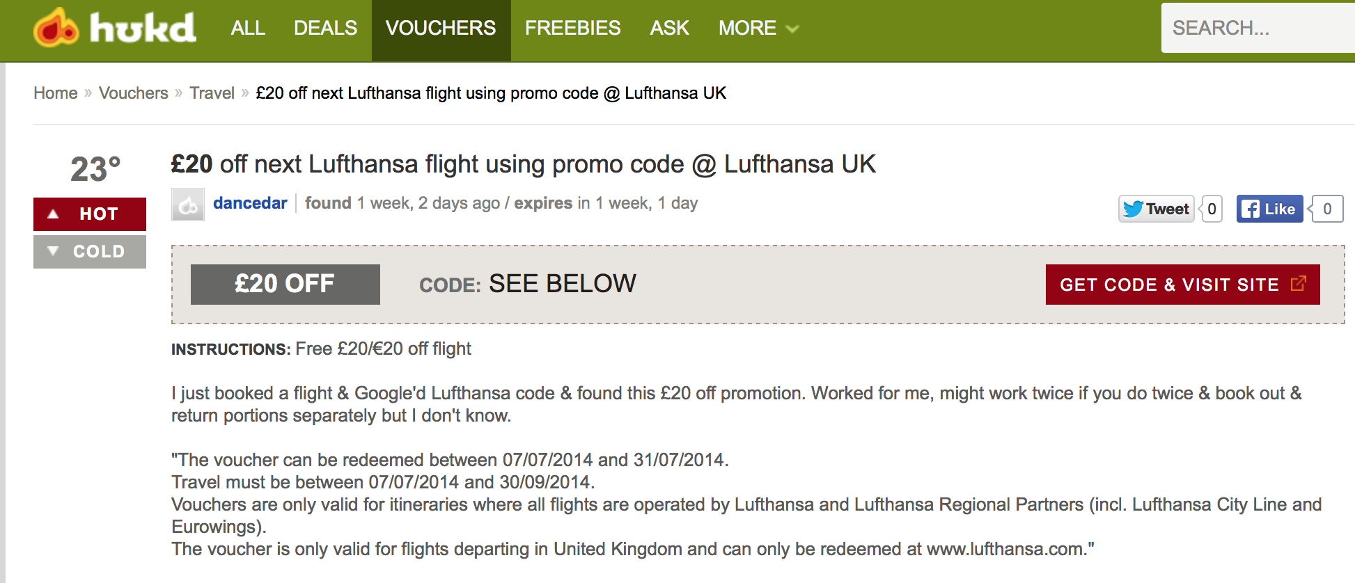 For example looking today, I found an excellent £20 money off voucher code for Lufthansa, valid till 31st July, 2014.
