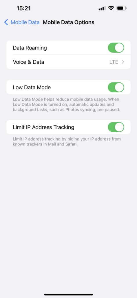 Another very handy feature of the iPhone is the ability to switch to ‘low data’ mode when your data is about to run or you’re on a very pricy data tariff when travelling.