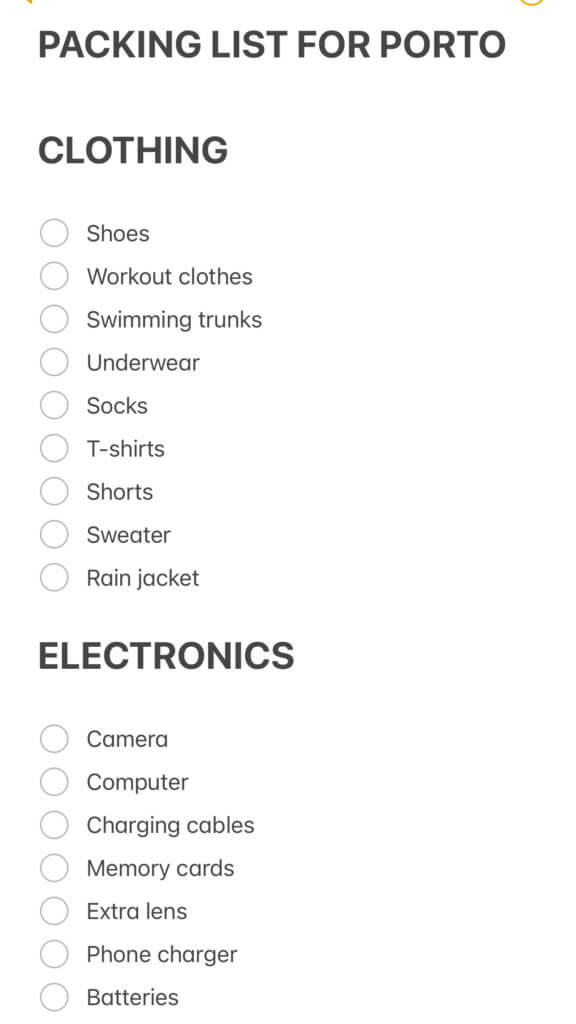 Apple’s built-in Notes app is the perfect place to store all those snippets of info you accumulate when planning something like a vacation. You can create packing checklists, ( like the one I have created below for my upcoming trip to Porto ) collect web pages which you want to bookmark for the trip plus even you can even scan important documents like your passport and have them saved on the app. You can share that note with any number of people and all read and update it. The other plus point is that if you have an iPad or MacBook , notes and reminders both sync seamlessly on all of your device.