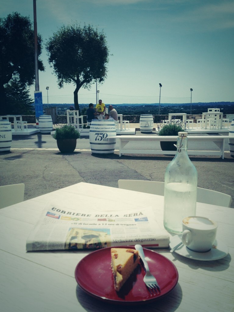 Our typical Puglian breakfast at Docks 101 each morning would be a strong espresso along with a crostata marmellata ( closest thing in the UK to this is a Jam Tart) or chocolate torte. This would be enjoyed outside in the full blaze of morning sunshine with a copy of the Corriere della Serra…of which I understood very little but still nothing beats the smell of a fresh morning paper and coffee.