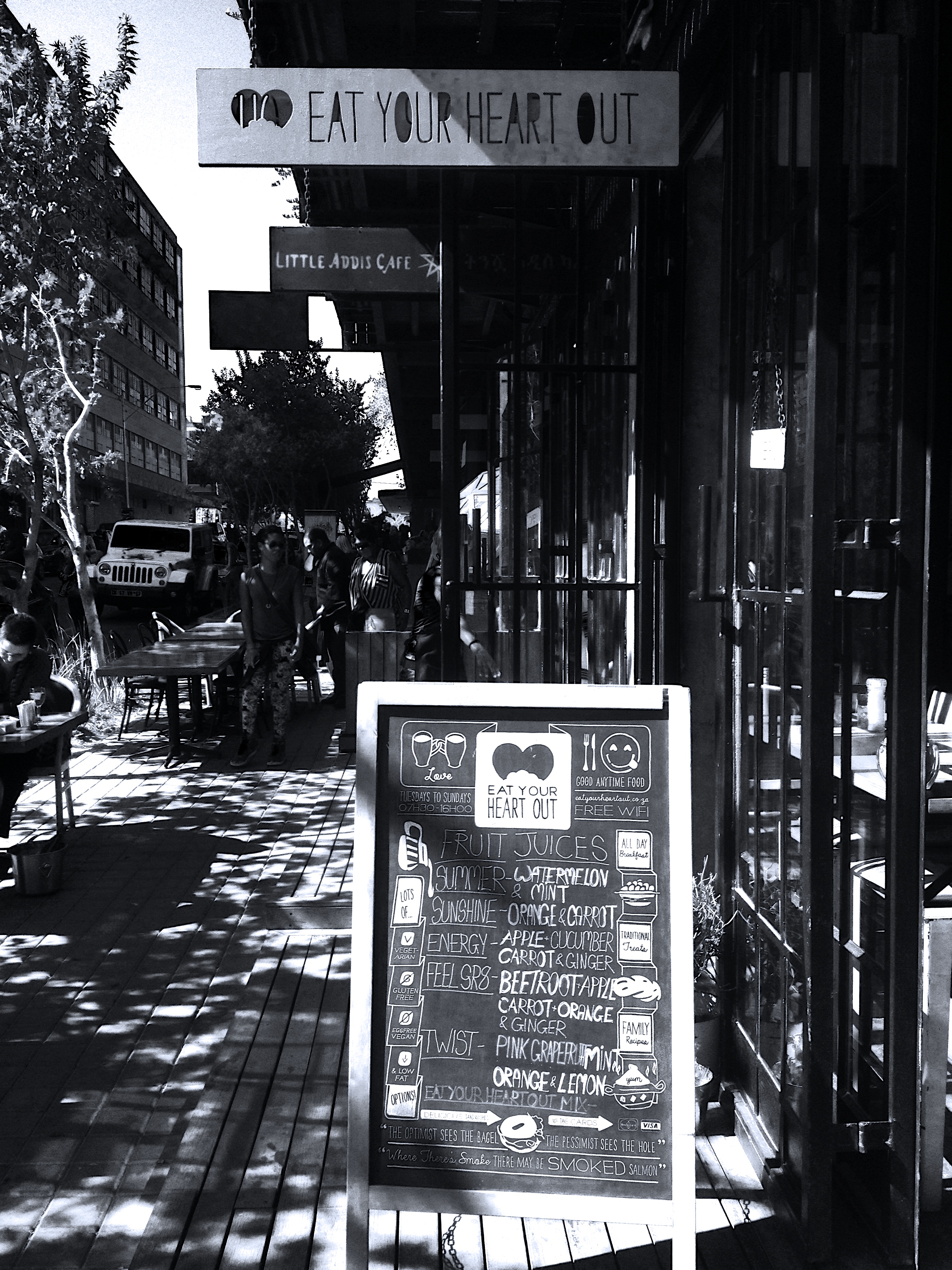 Little Addis on Fox Street is a must try food experience. Serving their famous meat and veggie combo injera platters as well as several traditional ethiopian delicacies, Kassa’s kitchen serves up delicious and hearty meals from Tuesday – Sunday.Sundays in Maboneng Precinct: place is buzzing with characters…Sundays at Market on Main in Maboneng Precinct are amazing. You have salsa dancing on the rooftop bar, arts and crafts fair in an old warehouse and….chance to have a tasty lunch at tons of excellent food stalls spread throughout the complex. Great place.