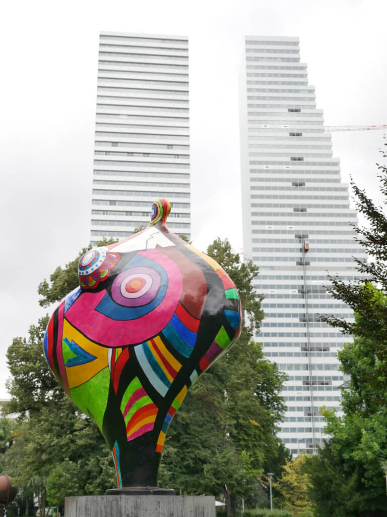 On our way to catch the Wild Maa ferry across the river to the Paper Mill ( tip from Christian, manager at the hostel) , we strolled through the beautiful Solitude Park next to the Rhine and the Museum Tinguely ( Later discover that Niki Saint de Phalle and Tinguely were partners in life and art, the ‘Bonnie and Clyde of the Art World’ ) we discovered one of Niki de Saint Phalle’s colorful painted polyester sculptures. I’m a huge fan of her buxom, bold and beautiful sculptures and followed her work ever since I saw an exhibition of hers in Nice. So this was a really cool discovery.