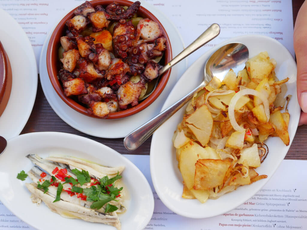 Stuffing ourselves with all that delicious Leckerli had killed our appetite a bit so we wanted a light bite to eat so the moment when we saw the sign of Tapas del Mar, we decided to give it a try. ( Nice gaggle of locals were drinking wine on their outdoor terrace so that gave us some confidence. ) Everything we ordered here was tasty- classic Pulpo alla Gallega, Salmorejo- cold tomato soup from Andalucia ( perfect for a hot day), Patatas Bravas and Boquerones en Vinagre– fresh anchovies, marinated in vinegar. Really good quality food, good service. Prices here are not cheap but in Basel, we came to expect that.