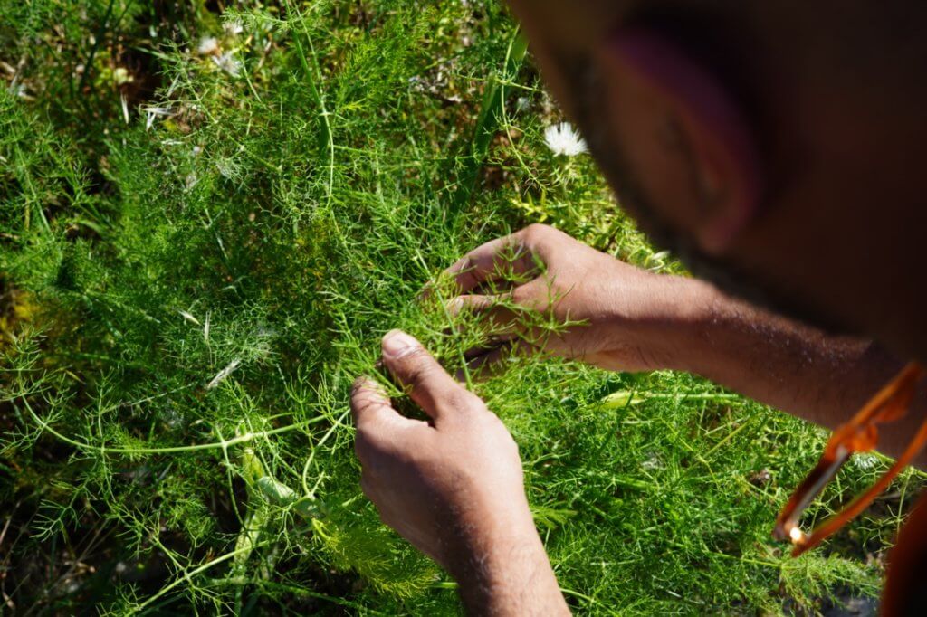I notice the clumps of wild feral fennel casually growing amidst the poppy flowers. We find our turn off, an overgrown path covered with a thicket of wildflowers of all the colours of the rainbow. I pause to take photos of them so that someone can identify them to me later. Besides the happy dance of swallows there is also the sweet meditative hum of bees, frolicking in the meadow of wildflowers. I close my eyes. Sometimes, travel presents you with these moments of almost near perfection.I soon hear a wild yelp of happiness from Sabrina. I open my eyes and see she has ventured forth, via a craggy slope through the impenetrable haze of wildflowers.