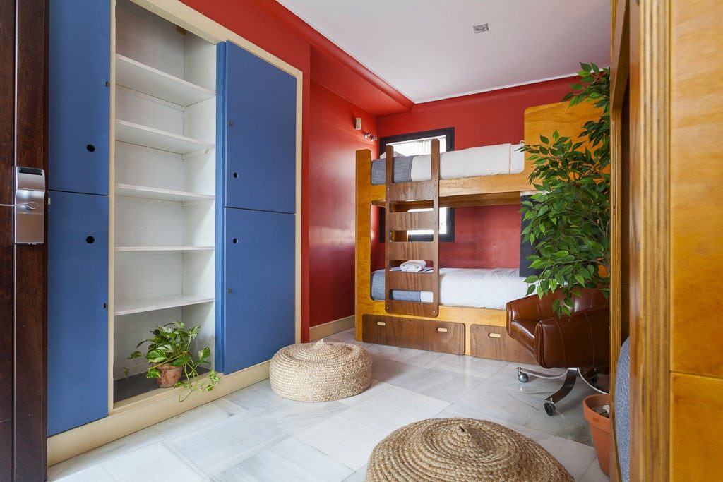 Being a proper backpacker style hostel, the rooms here are dorms only. They have 7 mixed dorms ranging from 4 to 8 beds. If you’re looking for a superior dorm experience then definitely book a bed in one of their boutique dorms, which feature ensuite bathrooms and beautiful handmade wooden beds. All guests have a secure locker to store their stuff. Just remember to bring your own padlock. Plus also worth noting that all the rooms here have air-conditioning, which is important given how hot the summers are in Seville. If you are travelling with family or your partner, then I definitely recommend choosing one of their luxury apartments. The apartments are offsite and just a few hundred yards away. This option allows you to combine the luxury of having your apartment yet being able to take advantage of the social aspects of the hostel like the staff, the common lounge and also their amazing rooftop terrace dinners.