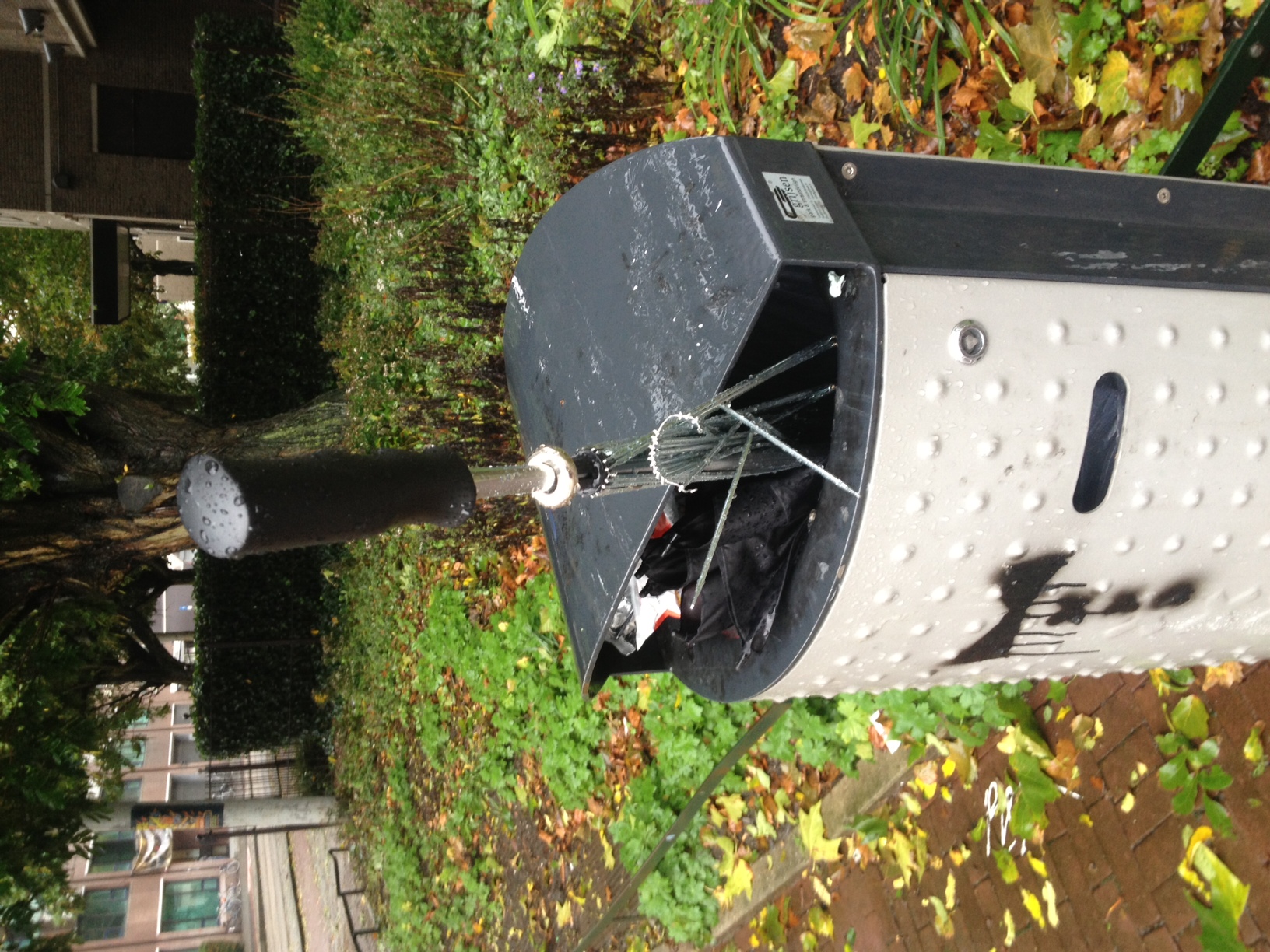 Every 5 steps, we found broken umbrellas sprayed across the pavement or jacked into bins.