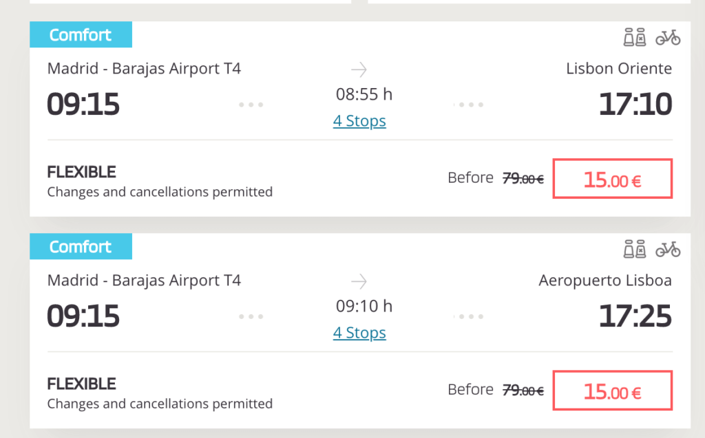 Alsa is also a good option if you are looking for the cheapest way to travel from Spain to Portugal- the Madrid to Lisbon bus costs as little as €15 ( Dates in March 2022, extra fee for seat reservation and also luggage )