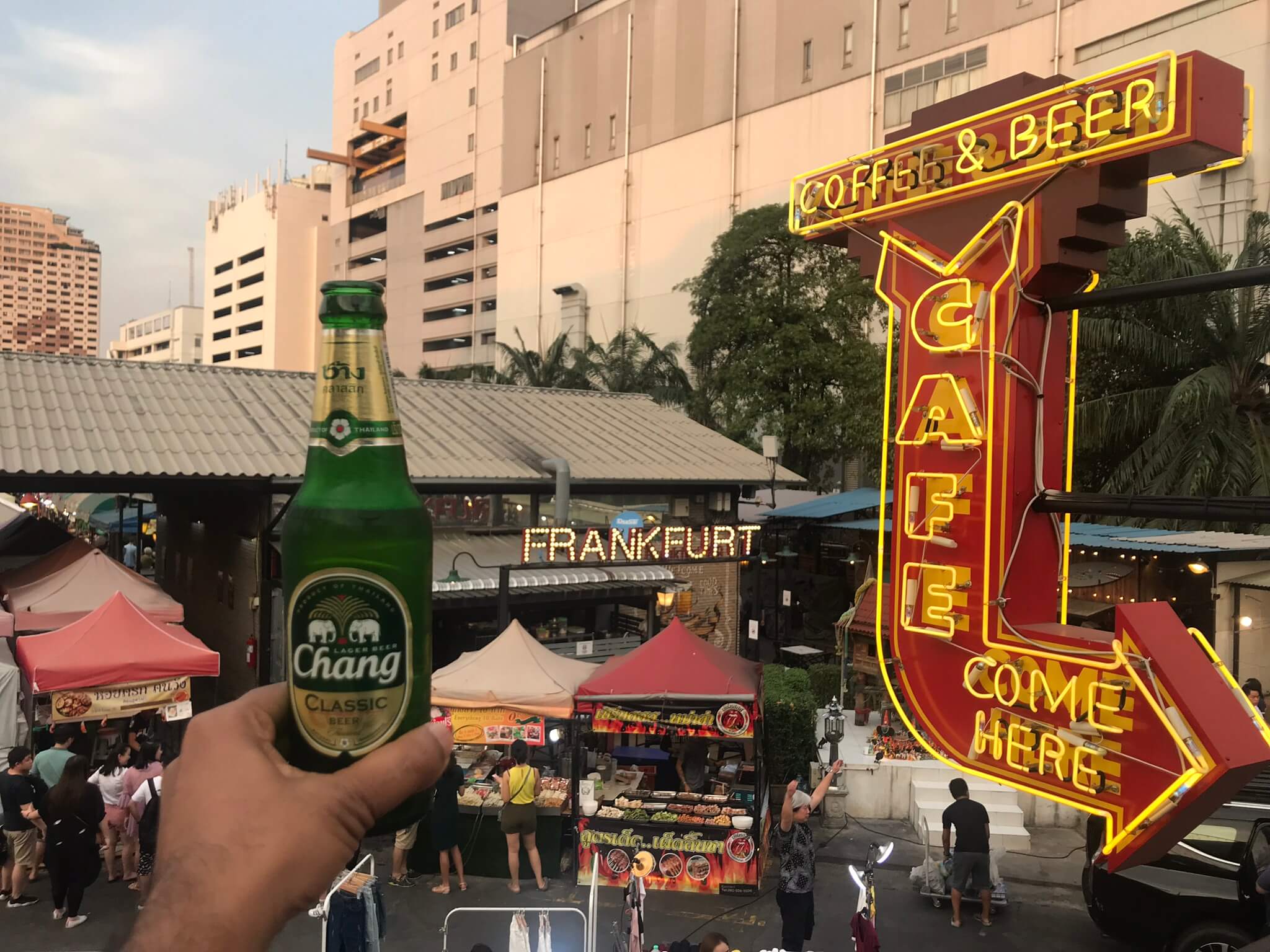 Every city has their rituals, places and people that you miss. One of the things, both me and Sabrina love about Bangkok and Thailand in general, are their night markets. After the humidity and oppressive heat of daytime, the markets are an opportunity for market traders to sell their goods in a more relaxed atmosphere. Locals come here to unwind and relax after a long day of work. Bangkok explodes into life, a riot of neon, of colour, of beautiful exotic smells and humanity. Nothing sums up the magic and romance of Bangkok better than these markets. So naturally, the first thing we did after dumping our bags in the hostel, was to pay a visit to a night market. There is an incredible array of night markets to choose from but one of our favourites is the Night Train Market Ratchada. Opening everyday from 5PM to 1AM , the Night Train Market is located right behind Esplanade Cineplex on the busy Ratchadapisek Road. We arrive around 6pm at dusk. We grab a big bottle of Chang beer and jump to the roof of one of the bars, just in time to see the sky darken and admire the market’s colourful tents slowly illuminating in the dark.