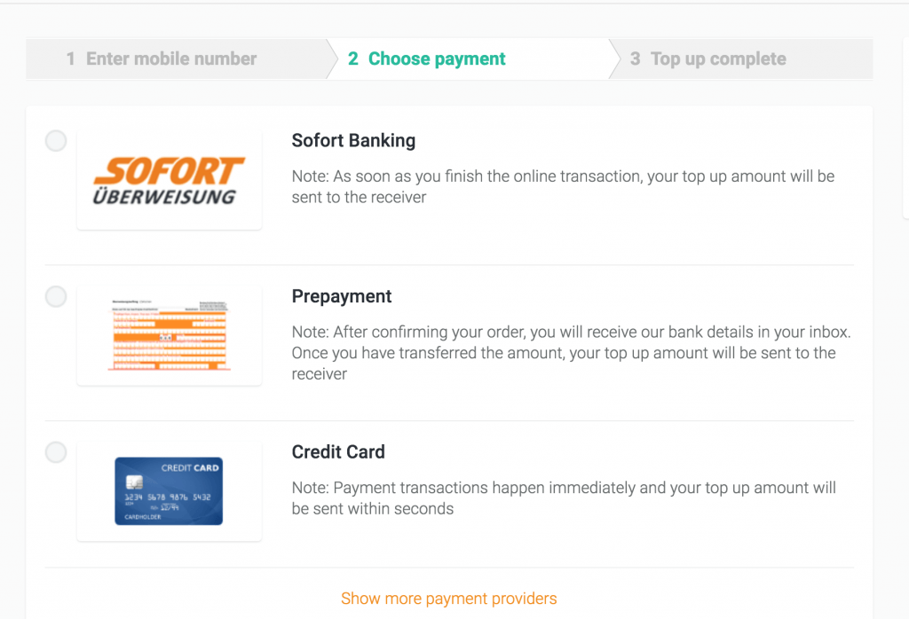 Once you’ve selected the number you’d like to send credit ( Minimum is €10 with a €0.99 charge for German mobiles) you then choose the mobile phone operator you have.
