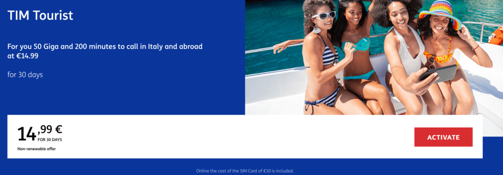 TIM are offering for 30 days 50GB of data plus 200 minutes talk time ( In Italy and Abroad ) for a one-off payment of €24.99