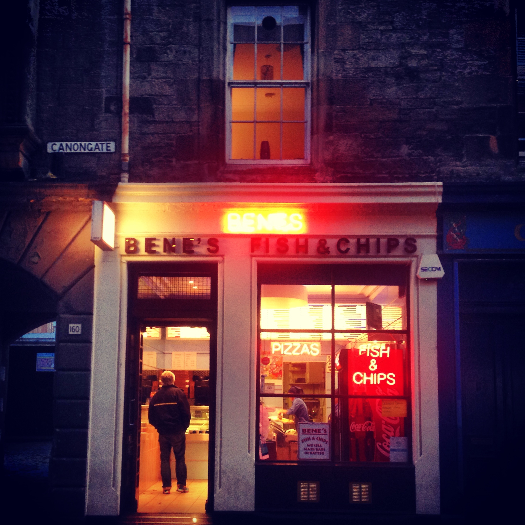 Plus a few hundred yards down the Mile, I could pop into my favourite chippy- Bene’s ( in picture, where you can also sample that unique Scottish speciality- the deep fried mars bar )